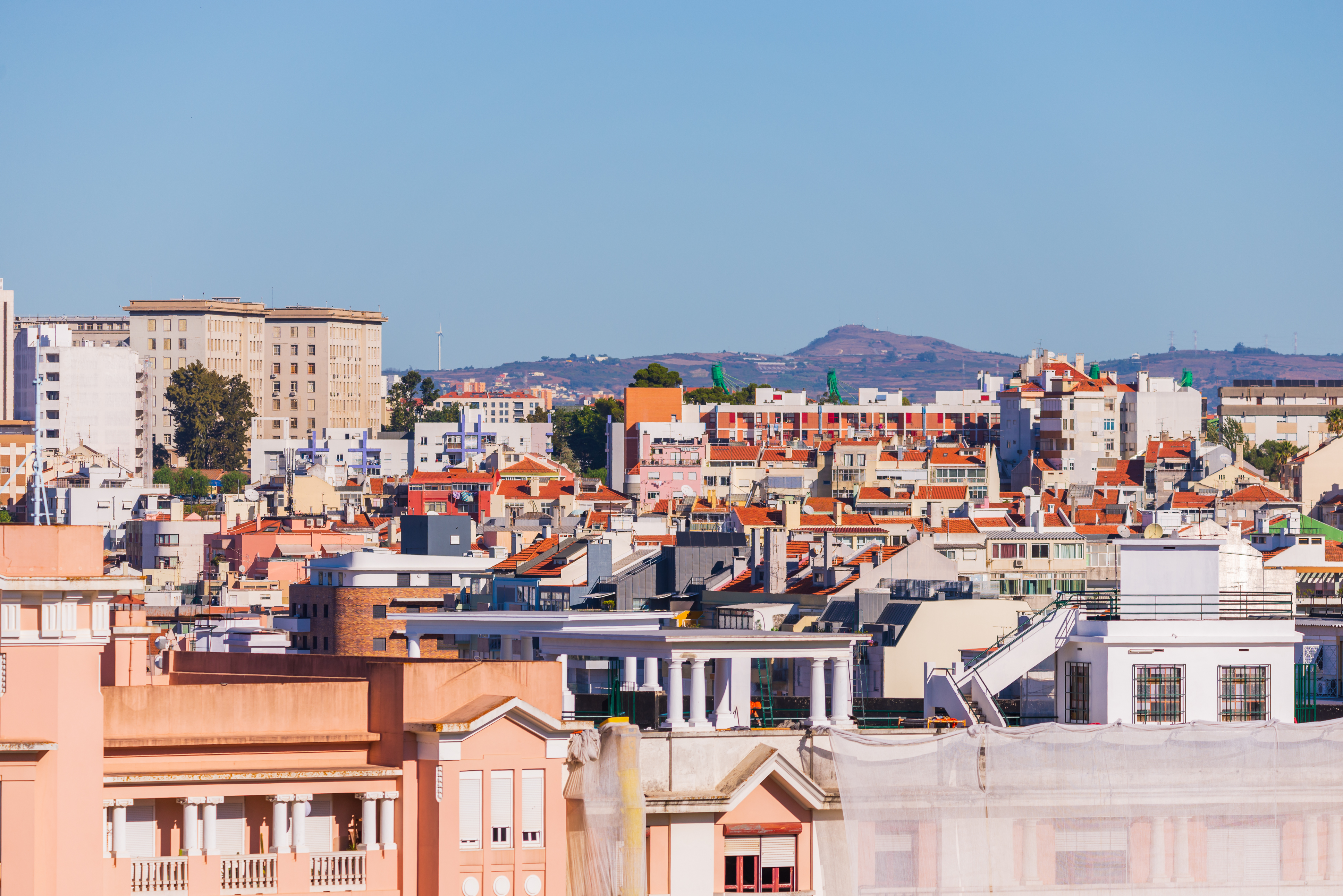 Вид с воздуха на старый город Лиссабон, Португалия, показывает уникальную атмосферу исторического центра города. Здания различных стилей, включая средневековые башни и современные офисные здания, создают контраст, который отражает вековую историю этого места. Расположенный на холме город окружен захватывающей панорамой океана с видом на Кристофора Колумба. Время съемки, возможно, приходится на ранний вечер, когда солнце только начинает закатываться, превращая облака в золотистые россыпи и освещая городские улицы мягким светом.