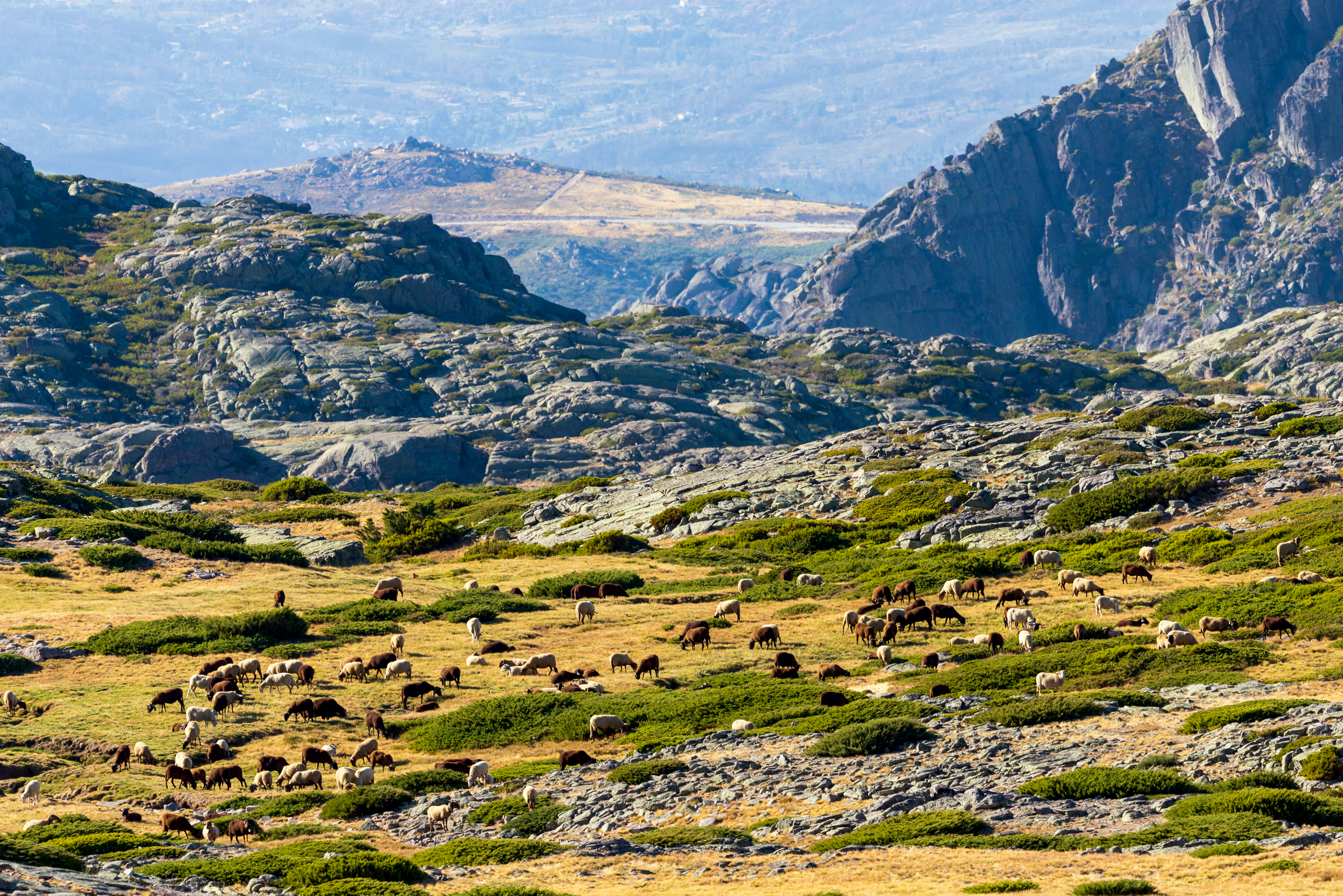 Стадо овец пасется высоко в горах осенью, когда листья деревьев стали ярко-желтыми и красными от перехода к зиме. Здесь можно увидеть живописную долину, окружённую золотыми хребтами гор. Вдали виднеются вершины, покрытые тонким слоем снега, что придает сцене дополнительный контраст и глубину. На переднем плане выделяется овца в белой шерсти, которая стоит одна среди других, создавая ощущение уединения и спокойствия.