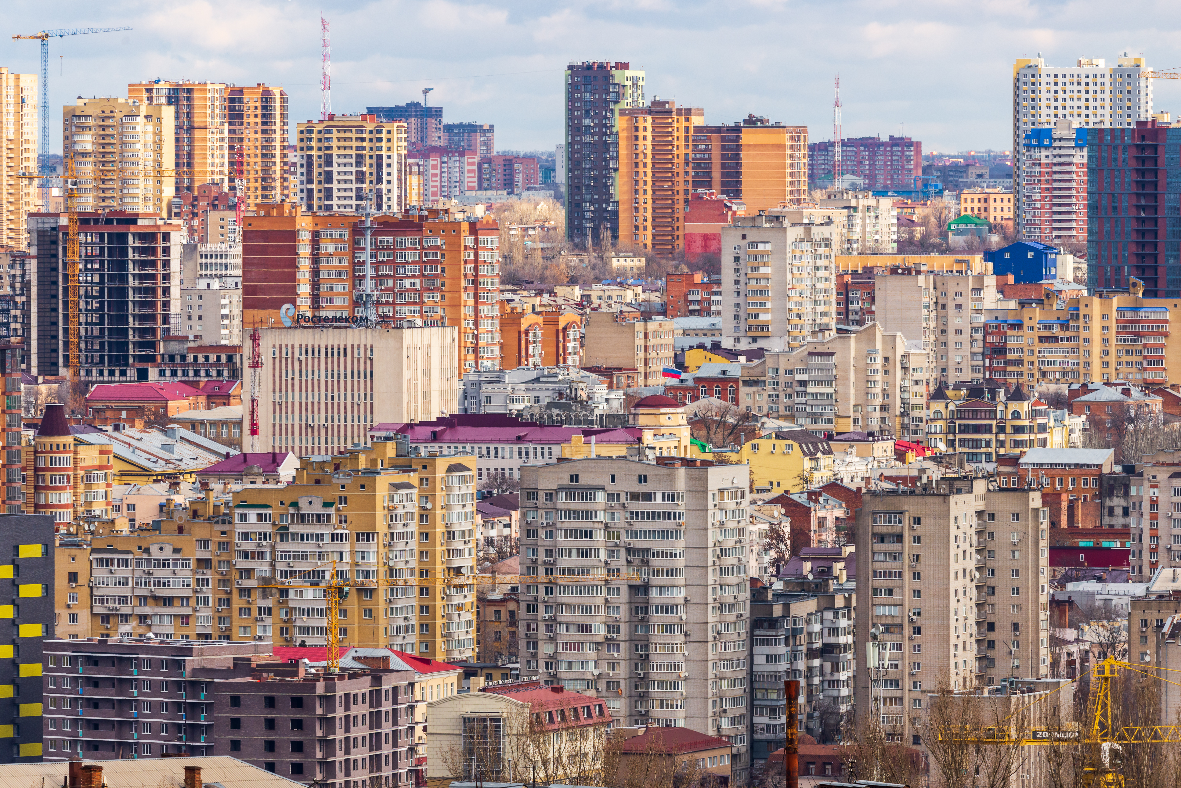 This breathtaking aerial view reveals the scale and dynamism of Rostov-on-Don, Russia, captured on January 23, 2020. The city's panorama showcases an impressive diversity of architectural styles, from modern multi-story residential complexes with vibrant facades to older buildings, all contributing to a unique urban landscape. Numerous construction cranes are visible in the frame, indicating the city's continuous development and growth.