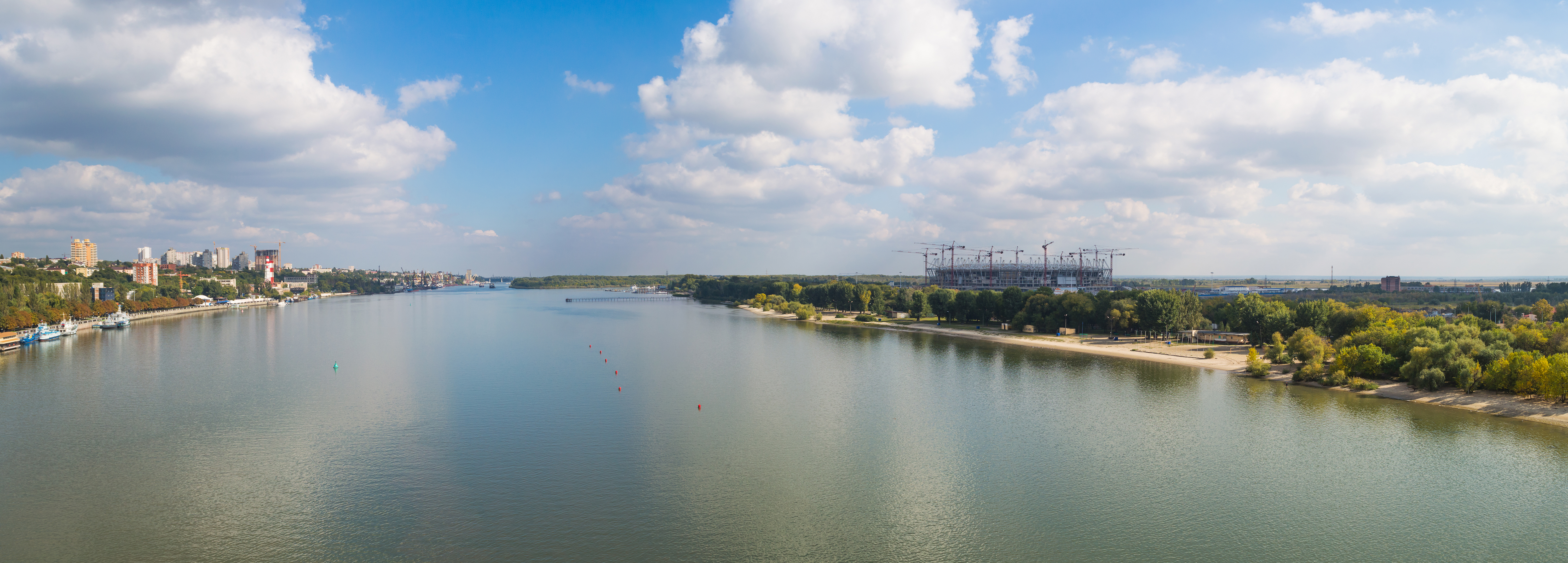На широкой реке Дон, протекающей вблизи города Ростова-на-Дону, раскрывается величественный панорамный вид, открывающийся с Ворошиловского моста. Вдали, на востоке, простирются берега, покрытые зеленью и промышленными объектами, а в центре композиции — остров Зелёный, выделяющийся своей растительностью и архитектурой. Вода реки, отражающая небо и мост, имеет насыщенный сине-зеленый оттенок, что придает сцене ощущение спокойствия и величия. Вид с моста позволяет охватить как природные, так и человеческие элементы ландшафта — от гладких волн до улиц и зданий, которые сопровождают берега. Время съемки — вероятно, утро или вечер, когда солнце создает мягкий свет, окрашивая поверхность реки в золотистые и розовые тона, что усиливает романтическую атмосферу.