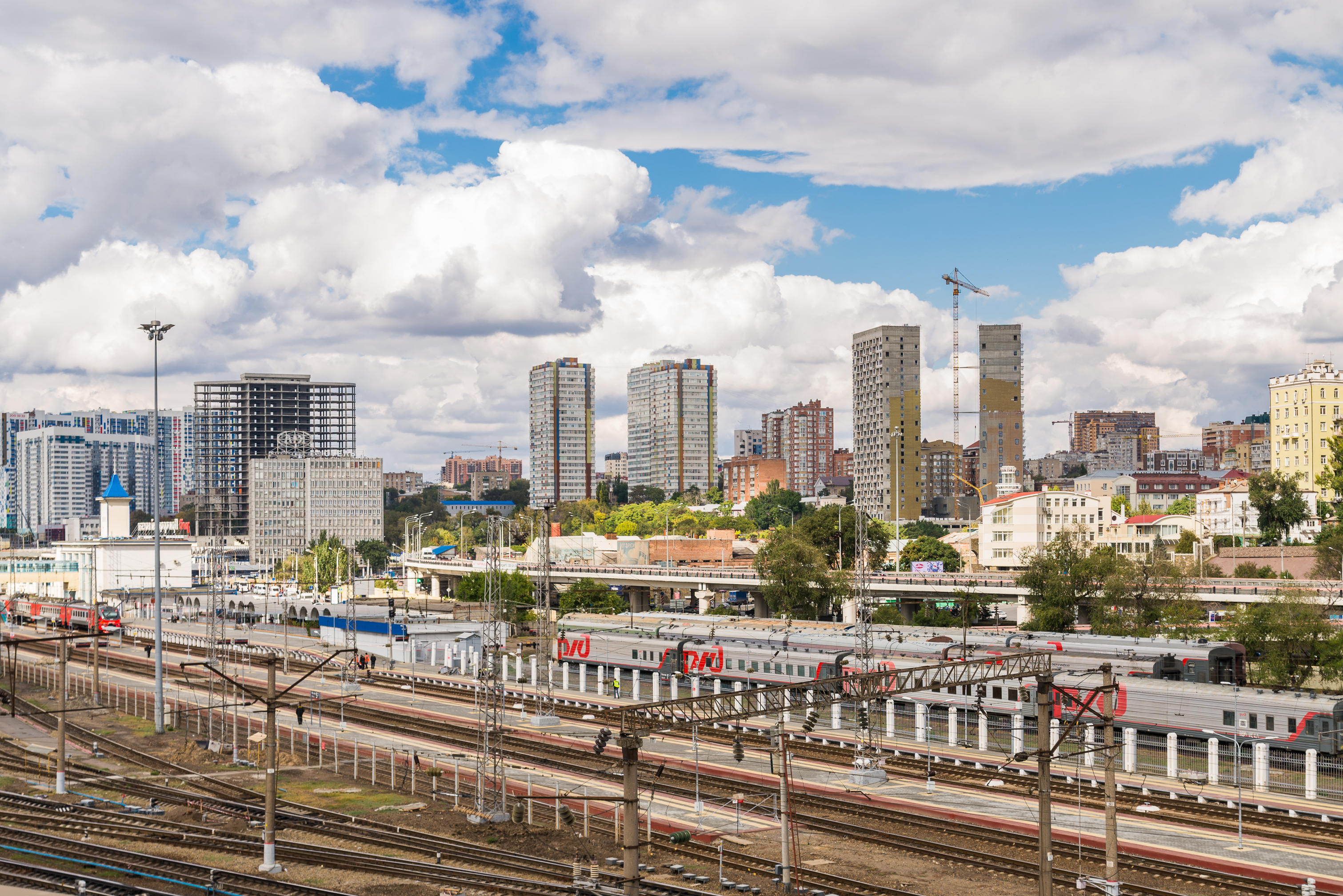 This shot, taken on September 26, 2018, in Rostov-on-Don, captures the vibrant atmosphere of a city train station. The focus is on the numerous railway tracks where trains are moving, ready to depart or welcome passengers. In the background, a modern cityscape unfolds with high-rise buildings, reflecting the dynamic development of the city. Bright sunlight, breaking through picturesque clouds, creates a contrast between the industrial zone of the station and the serenity of the sky.