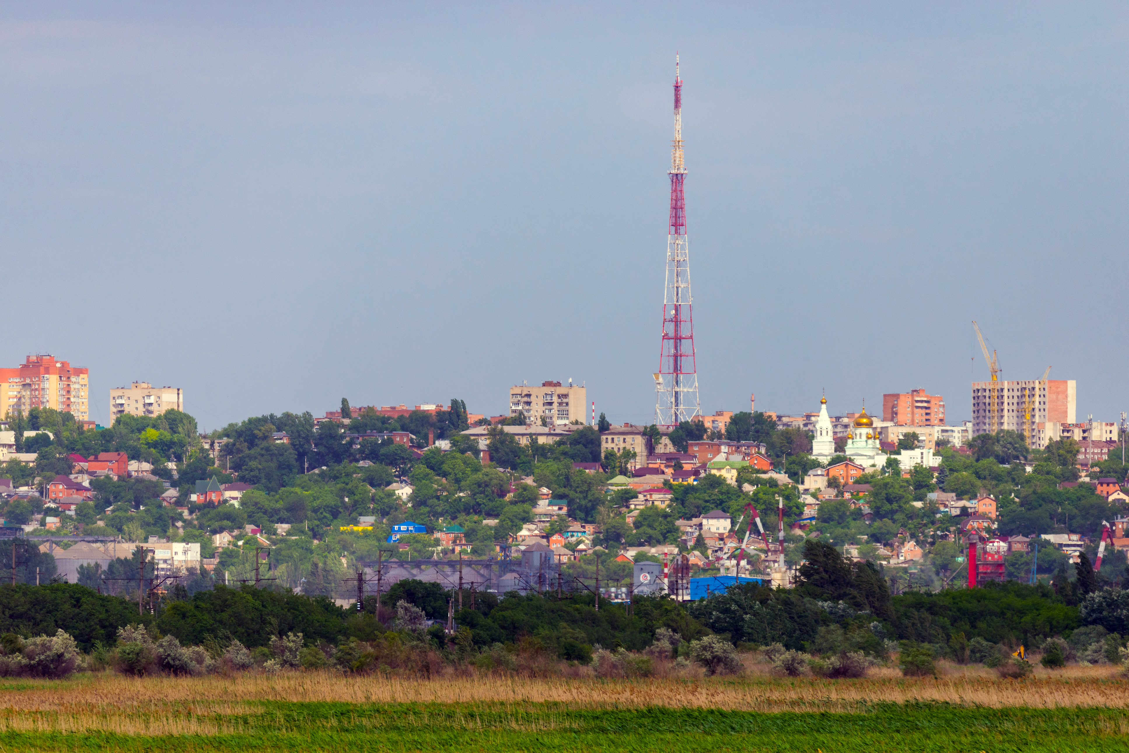 This panoramic cityscape captures the skyline of Rostov-on-Don, with a towering radio communication structure dominating the horizon. The foreground features expansive green fields and shrubs, creating a striking contrast between urban development and natural landscapes. Residential buildings, including modern high-rises and traditional structures with red roofs, are nestled among lush tree-covered hillsides. A distinctive golden-domed church adds cultural character to the scene. The clear blue sky suggests a bright summer day, with sunlight casting soft shadows that enhance the depth of the composition.