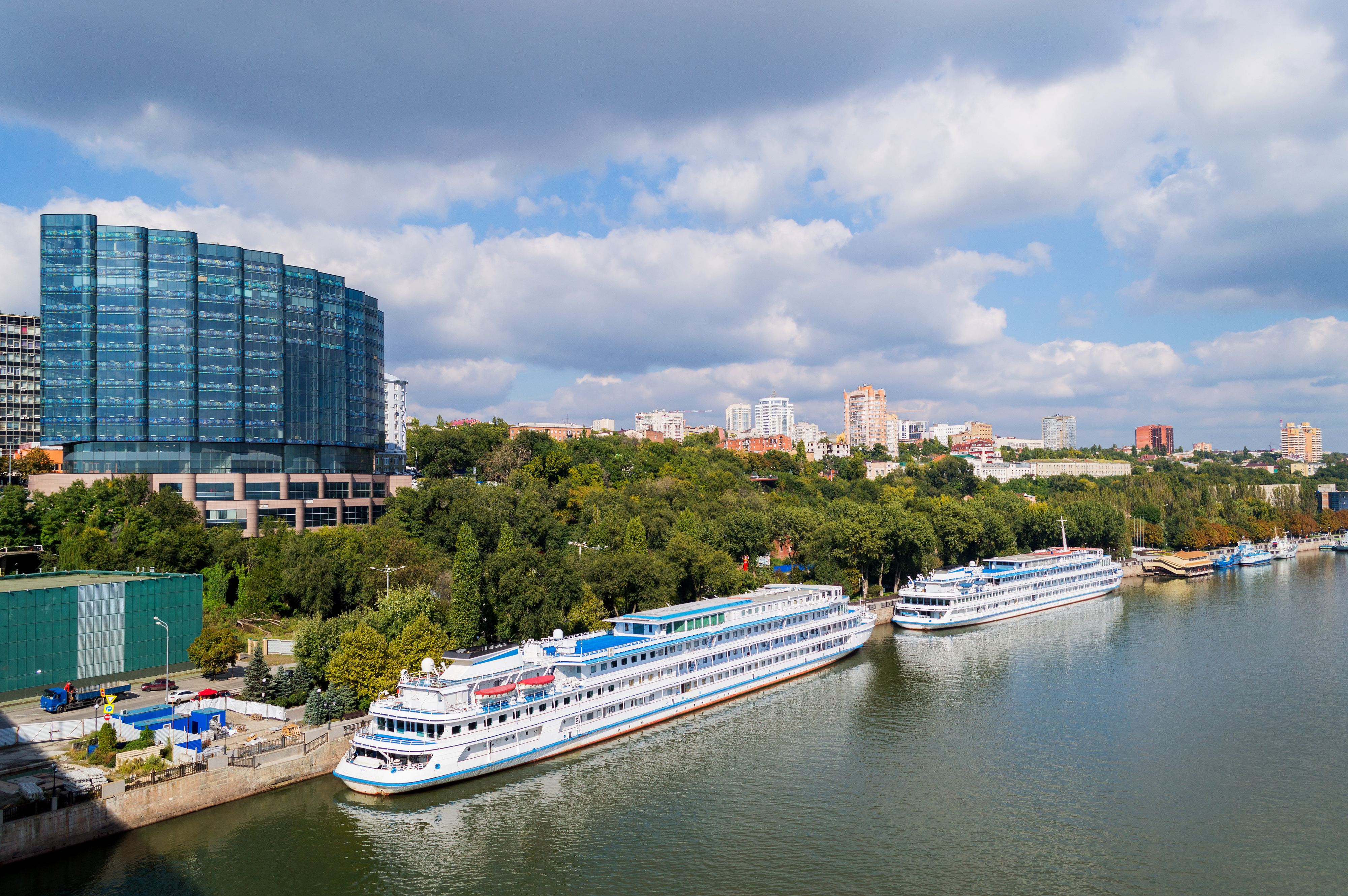 На изображении представлен величественный круизный лайнер, который пришвартован к живописной набережной Ростова-на-Дону — крупного портового города на юге России, где сливаются морская история и современная инфраструктура. Город раскинулся на семи холмах, создавая уникальный рельеф, который придает панораме динамичность и глубину. Вид с Ворошиловского моста позволяет охватить масштабную сцену: от гладкой поверхности Дона до узких улочек и архитектурных форм, которые вырисовываются на фоне закатного неба. Солнечный свет мягко освещает корпус корабля, подчеркивая его гладкие линии и отражения в воде, в то время как городские здания, от старинных кирпичных построек до современных стеклянных небоскребов, создают контраст между историей и прогрессом. Воздух наполнен ощущением спокойствия и величия, словно город дышит в ритме прибоя и гудения двигателей.