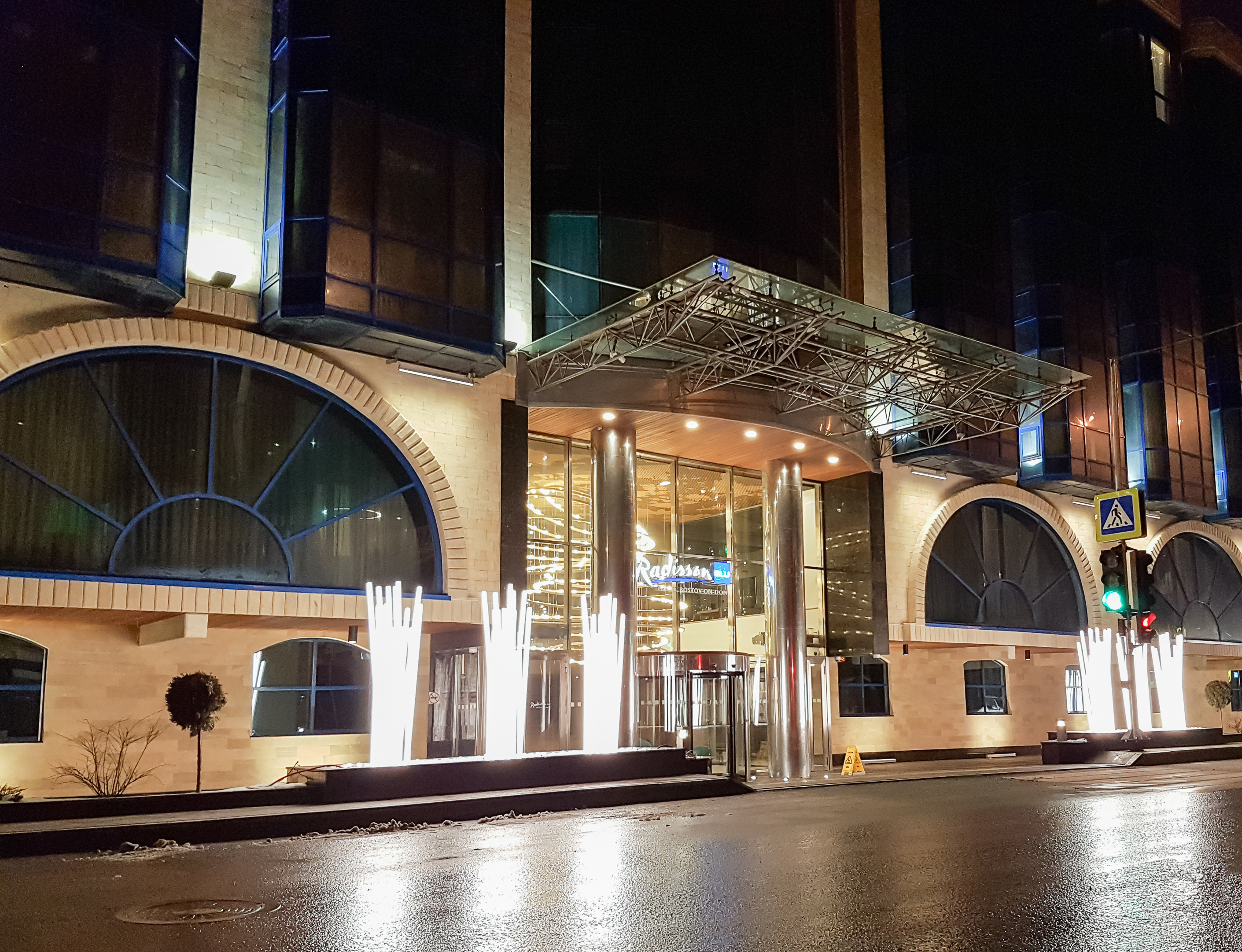 15 февраля 2018 года, в России, в городе Ростов, был запечатлен величественный вход в отель Radisson Blu. Это ночное изображение передает атмосферу элегантности и уюта, характерную для этого известного отеля.