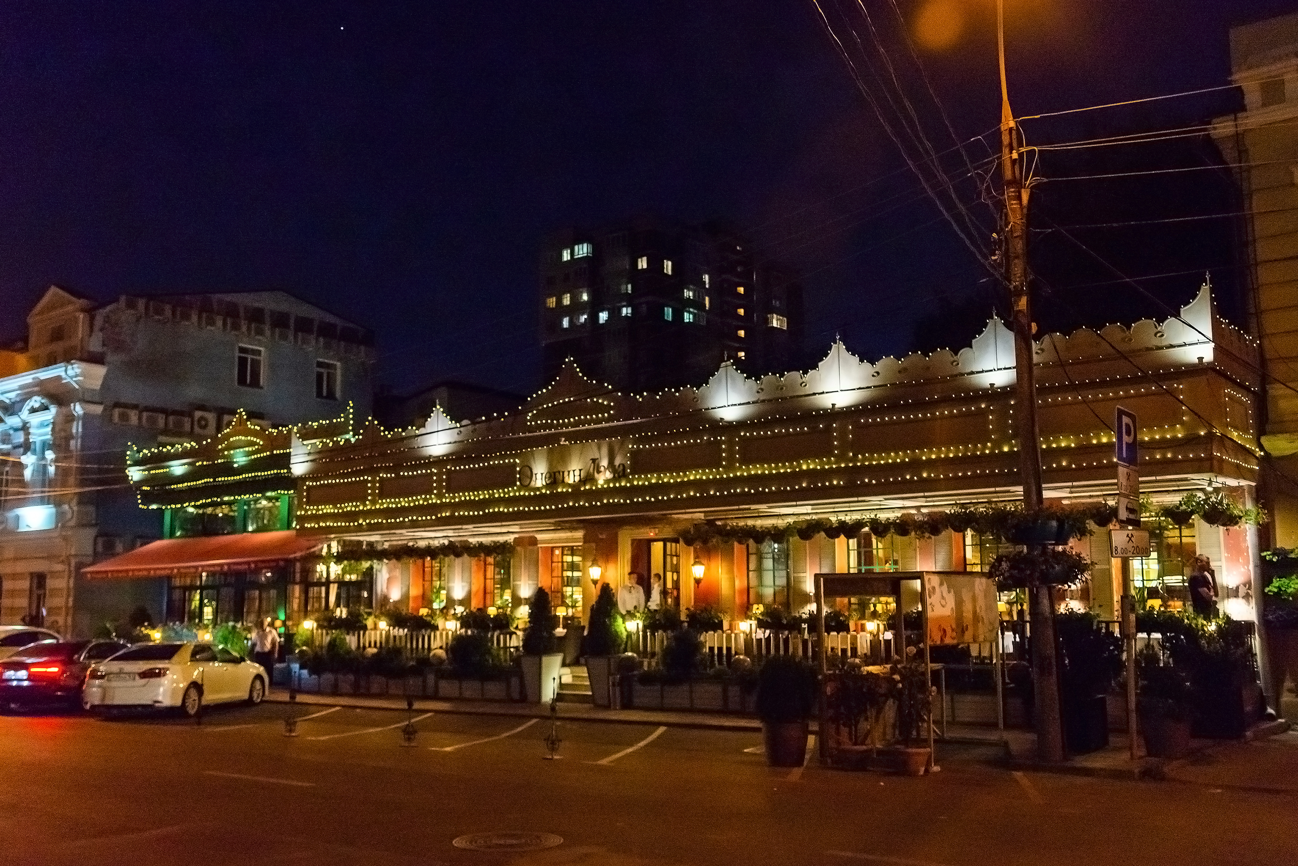 Фотография запечатлела очаровательный вид ресторана в вечернее время, утопающего в мягком свете гирлянд. Здание, украшенное множеством мелких лампочек, излучает тепло и приглашает посетителей окунуться в уютную атмосферу. Фасад ресторана выполнен в классическом стиле, с декоративными элементами, которые подчеркиваются освещением, создавая праздничное настроение.