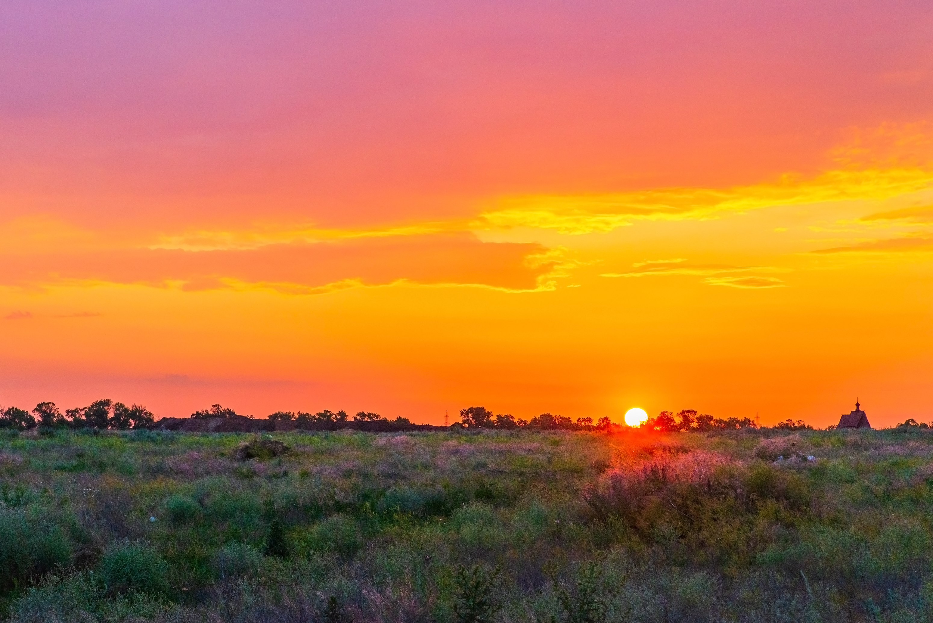 Композиция продумана с учётом переднего плана, заполненного текстурой зеленой травы и дикой растительности, которая контрастирует красиво с ярким небом. Облака мягко освещены заходящим солнцем, создавая мягкие градиенты от яркого оранжевого до нежного розового. Текстуры травяных листьев и листвы добавляют богатство, а естественное освещение усиливает глубину и объём.