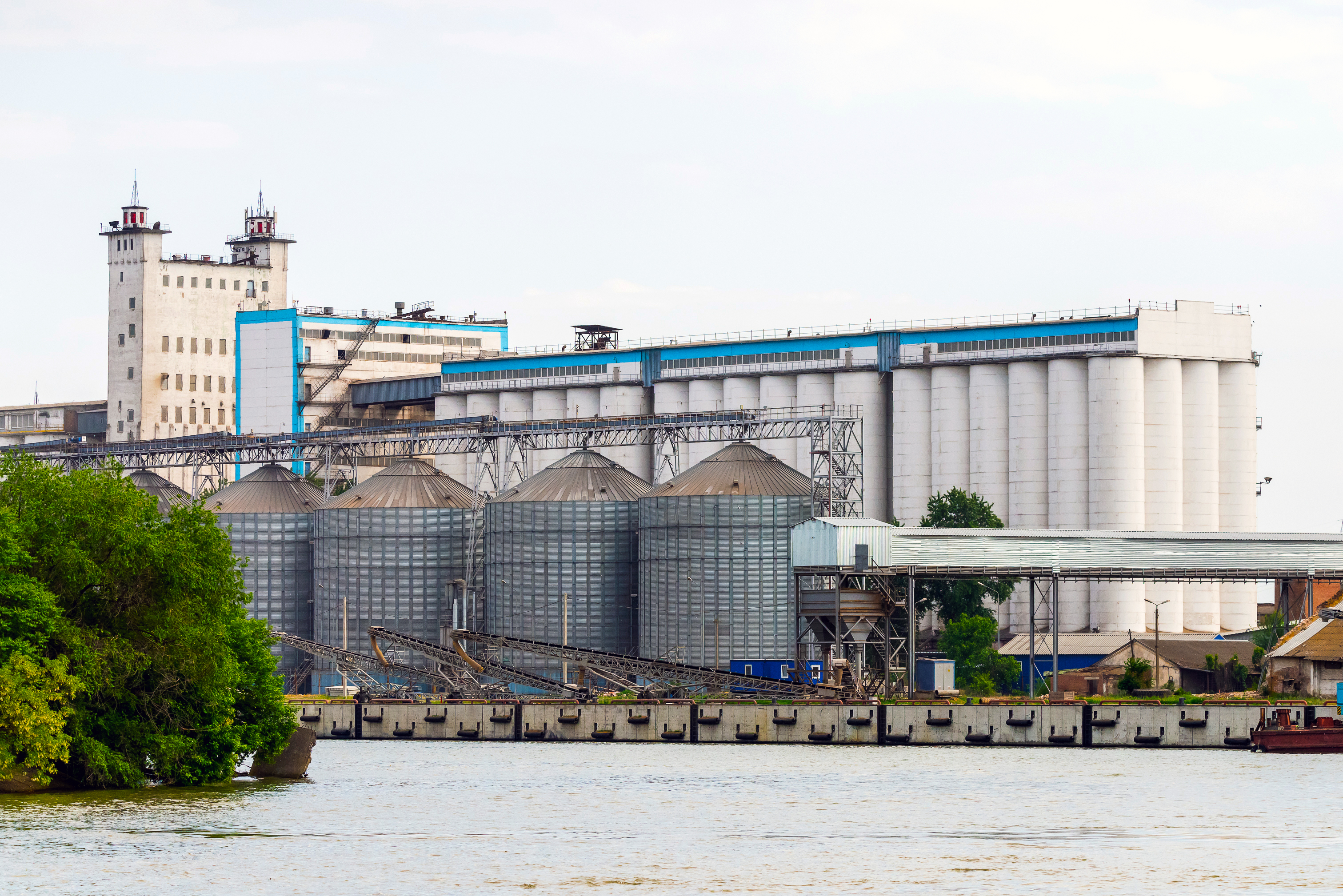 The photograph's color palette includes muted grays of metal silos, contrasting with blue architectural details and green foliage on the riverbank. The lighting is soft due to cloud cover, creating gentle shadows and highlighting the rough surfaces of concrete and metal. The perspective is from a distance along the water’s edge, offering a clear view of the facility’s scale and layout. Conveyor belts and loading docks are visible, indicating active cargo operations.