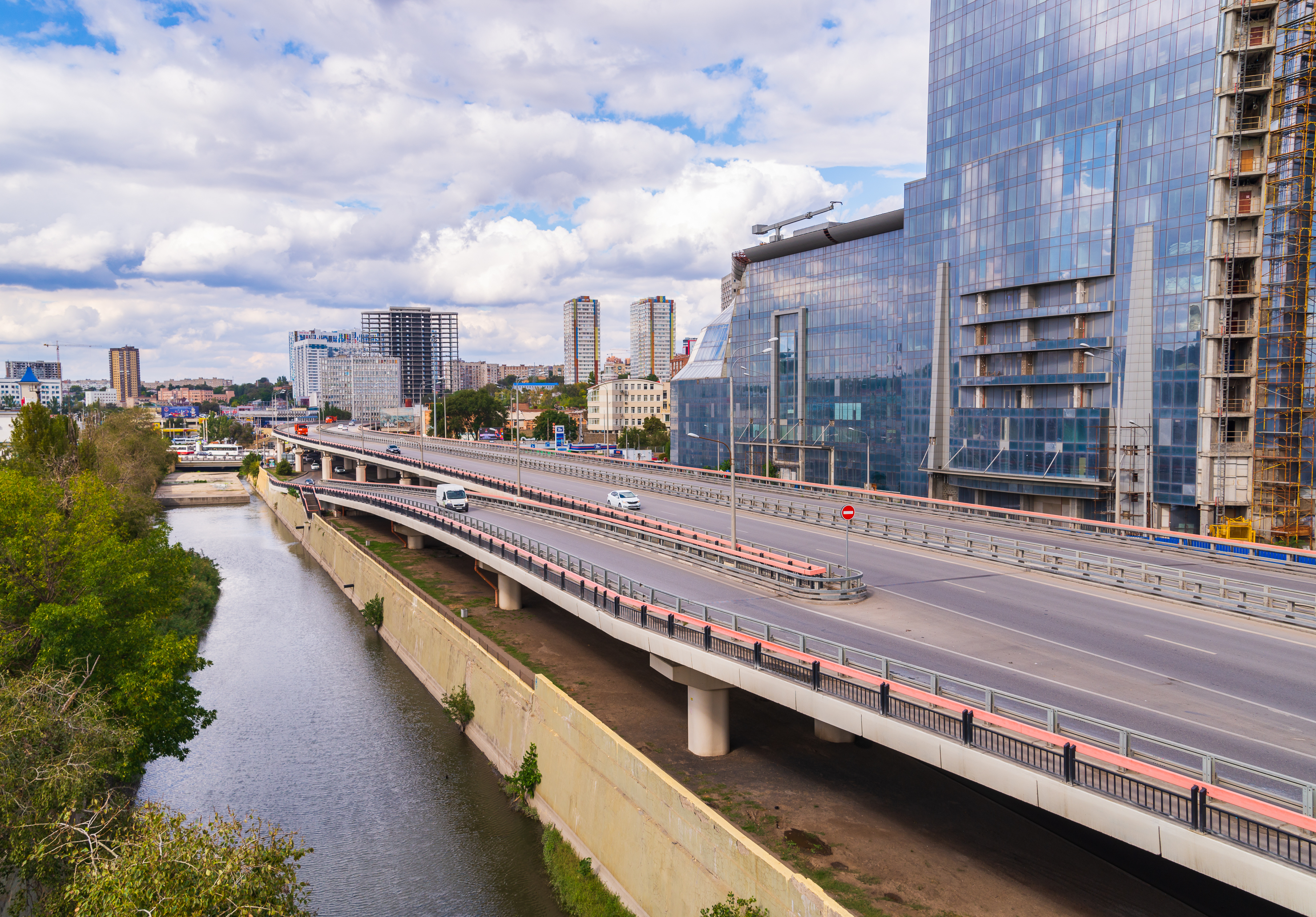 This captivating image presents a dynamic urban scene where modern architecture meets natural elements. The composition centers on a multi-lane highway that gracefully arches over a calm, reflective river, creating a striking contrast between engineered structures and flowing water. On the right, imposing glass skyscrapers with their mirrored facades reflect the partly cloudy sky, showcasing cutting-edge contemporary design. The left side reveals lush greenery along the riverbank, softening the rigid lines of concrete and metal. In the background, a city skyline unfolds with various buildings under construction and completed structures, hinting at ongoing urban development. The scene is illuminated by bright daylight, casting sharp shadows and enhancing textures from smooth asphalt to rough concrete walls and reflective glass surfaces. This viewpoint captures the essence of metropolitan life: movement through traffic on the highway, the serene flow of water below, and the imposing verticality of skyscrapers dominating the horizon.