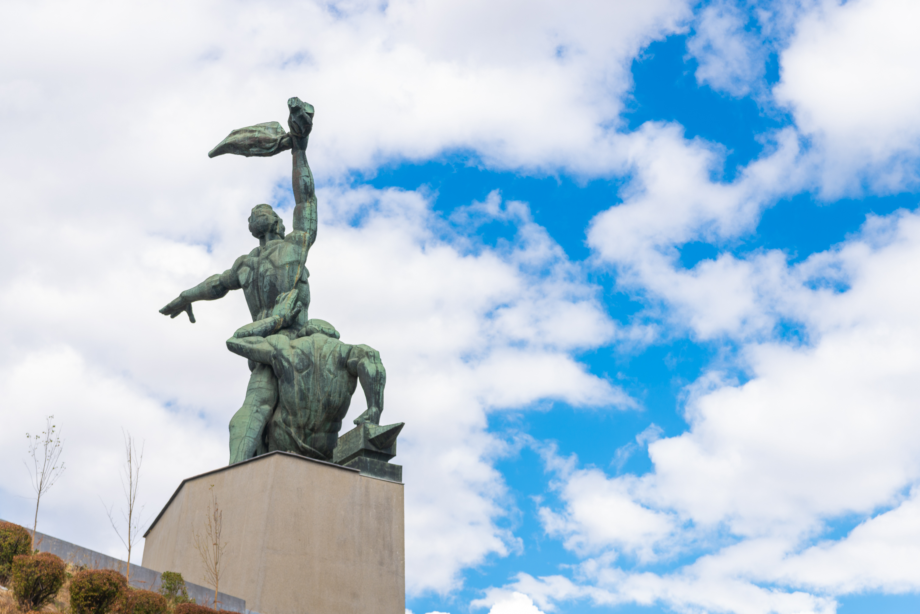 This majestic monument, located in the city of Rostov-on-Don, immortalizes the memory of workers, their resilience, and their struggle for rights. The sculpture depicts two male figures, cast in bronze, standing tall on a concrete pedestal. One figure, strong and determined, holds a banner raised high, symbolizing freedom, victory, and the aspiration for a better future. The other figure, positioned beneath it, represents labor and possibly the sacrifices made in the struggle.