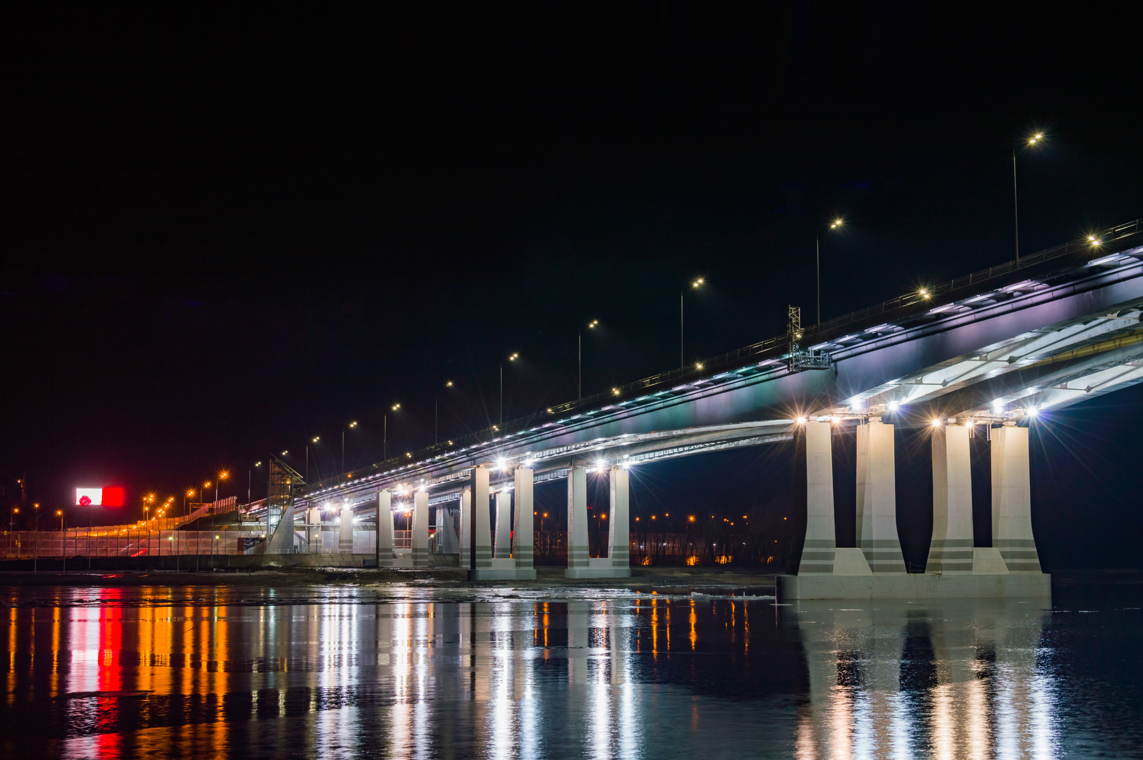 На снимке представлен величественный ночной вид на мост, перекинутый через широкую реку Дон, которая в темноте мерцает от отражений искусственного освещения. Мост, украшенный яркими огнями, создает впечатление живой архитектурной композиции, словно небесный мост, соединяющий два берега. Вид с высоты позволяет оценить масштаб сооружения, его изгибы и структуру, а также отражения в воде, которые добавляют сцене глубину и динамику. Небо, окрашенное в оттенки синевы и темно-фиолетовых тонов, создает контраст с теплым желтым и белым светом, исходящим от фонарей моста. Вокруг видны очертания городских зданий, их силуэты мягко смягчаются в ночном свете, придавая сцене умиротворяющую и почти мистическую атмосферу. Вода реки, как зеркало, отражает огни моста и небо, создавая эффект двойного изображения, что усиливает визуальную привлекательность снимка.