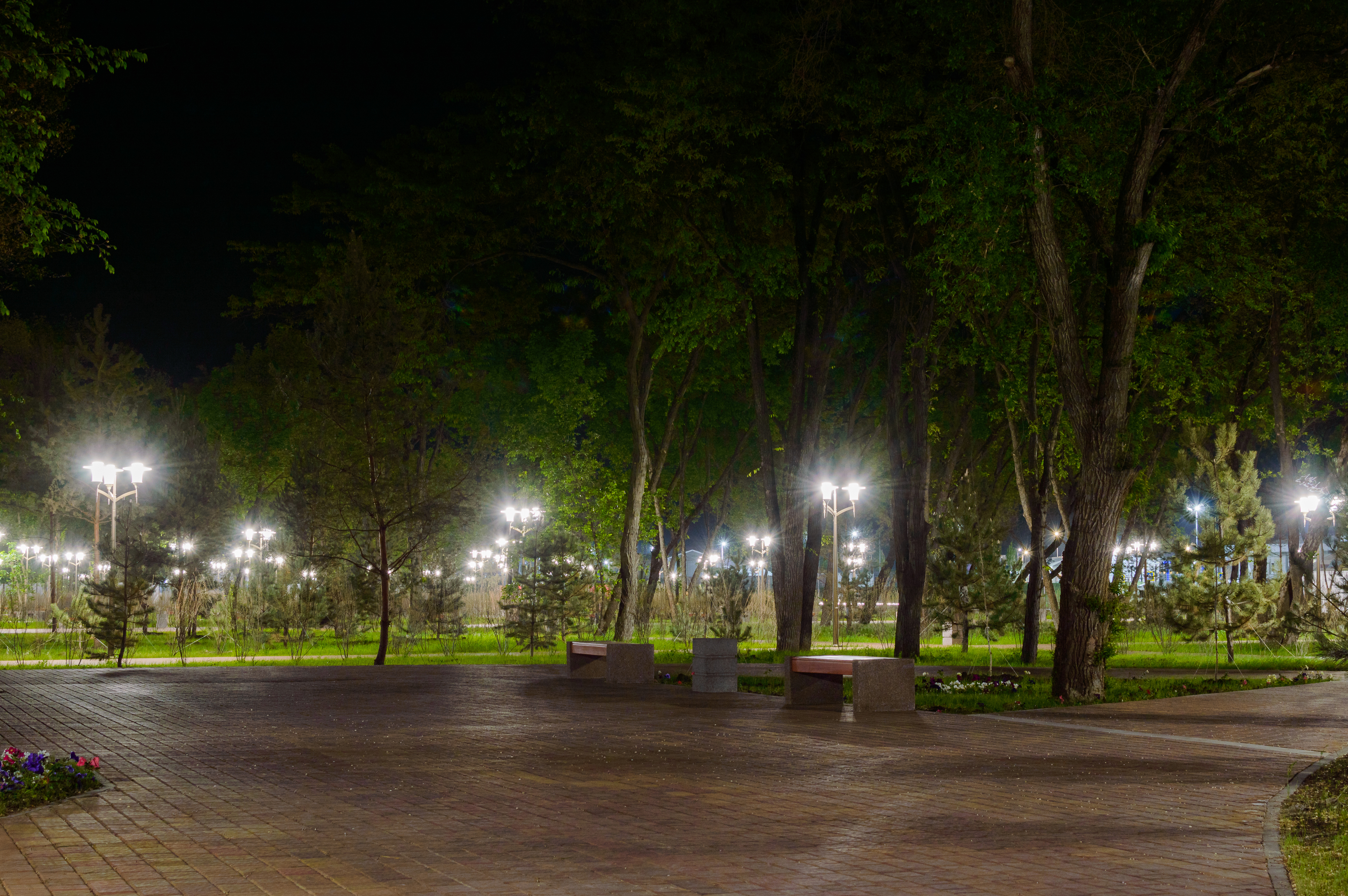 Эмоциональный настрой изображения — спокойный, задумчивый, почти мечтательный. Зритель ощущает себя не просто наблюдателем, а участником тихого вечера, где время замедляется, а мысли становятся яснее. Атмосфера — как в сказке, где город и природа слились в единую гармонию. Художественный стиль — реалистичный с элементами мечтательной романтики, где каждая деталь вносит вклад в общую мелодию умиротворения. Цветовая палитра сочетает в себе насыщенные оттенки синего и зеленого с теплыми желтыми и оранжевыми акцентами, что усиливает контраст и визуальную привлекательность. Это не просто фото парка — это портрет ночного города, где природа и архитектура делят пространство в танце света и тени.
