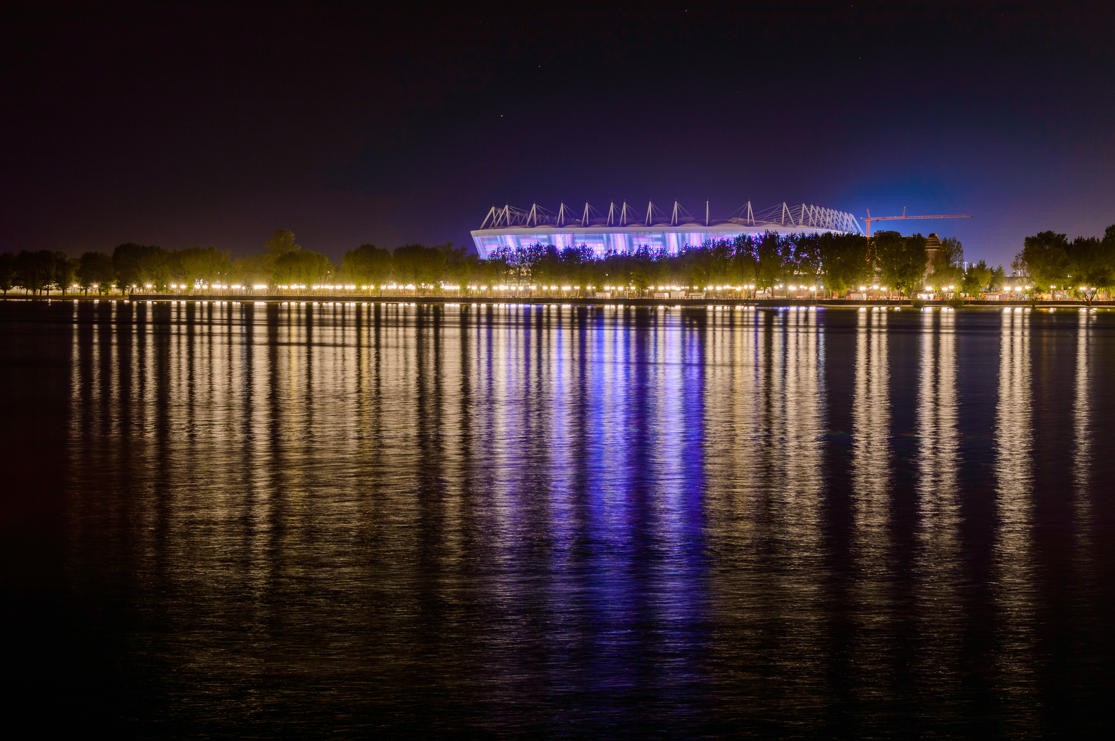 Особое очарование фотографии придает зеркальное отражение стадиона в спокойной глади реки, протекающей неподалеку. Игра света и тени на воде создает завораживающий узор, который удвоил красоту архитектурного сооружения. Яркая синяя подсветка стадиона контрастирует с теплыми желтыми огнями, идущими вдоль набережной, создавая живописную картину.
