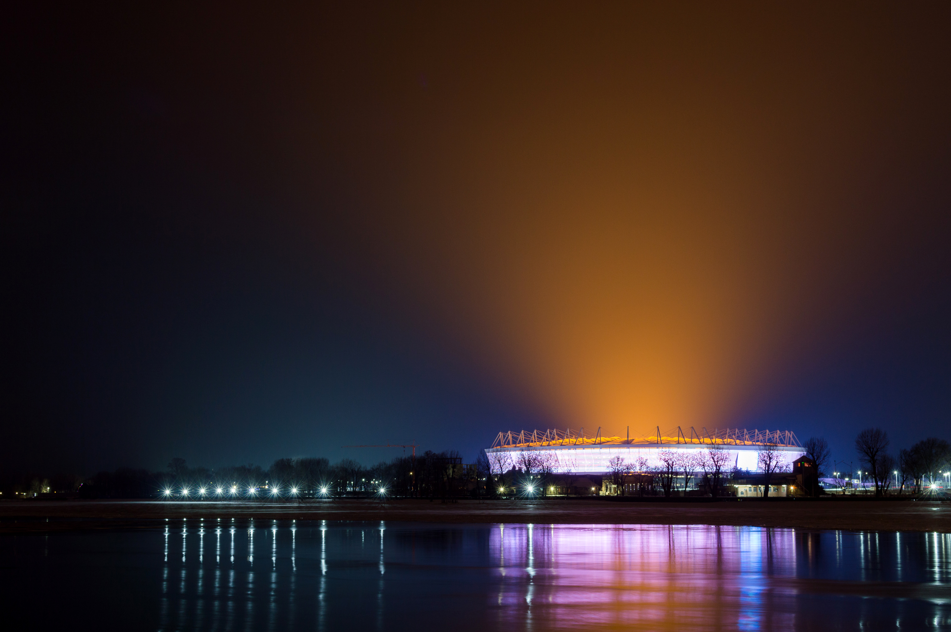 A captivating night view of the modern football stadium "Rostov Arena", located in the city of Rostov-on-Don, Russia. This architectural marvel, built specifically for the 2018 FIFA World Cup, is showcased in all its splendor under the cover of darkness. The stadium's bright and dynamic illumination creates a spectacular contrast with the deep night sky. Powerful beams of light emanating from the stadium pierce the darkness, painting the sky in warm orange and blue hues.