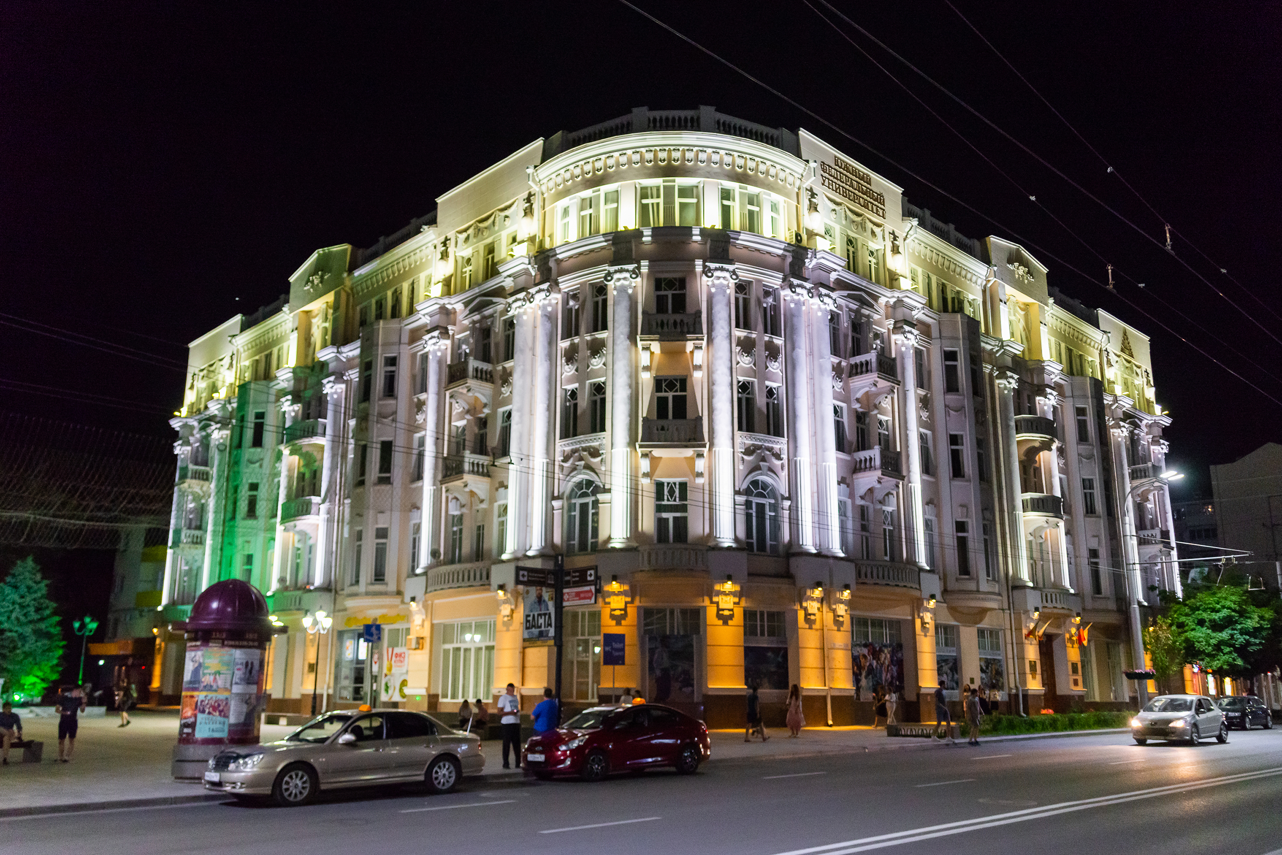 Запечатленное в ночное время, это изображение демонстрирует внушительное здание Южного федерального университета, расположенное в оживленном городе Ростов-на-Дону. Дата съемки – 21 июня 2018 года, что указывает на теплую летнюю ночь.
