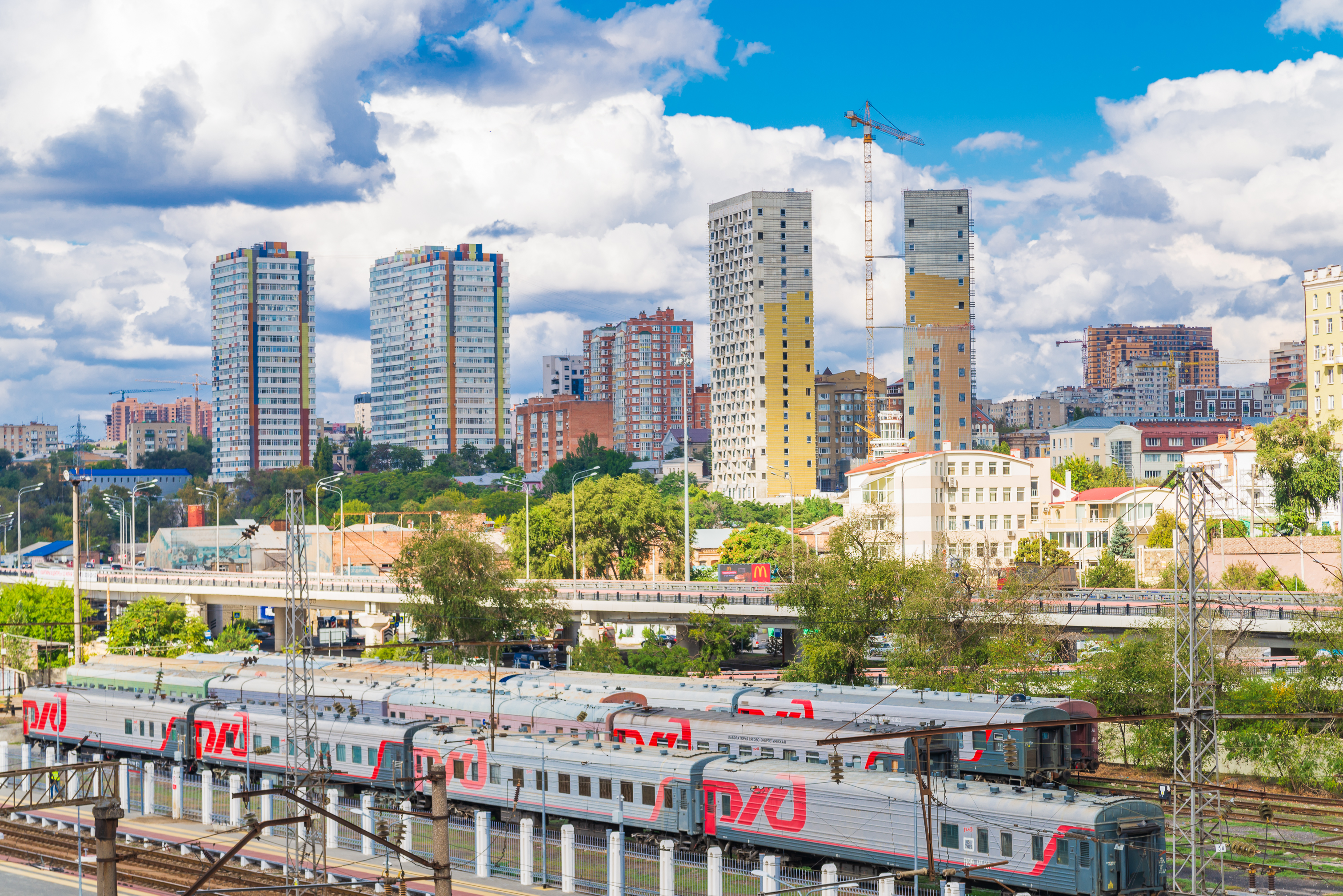 Trains on railway tracks at the city train station in Rostov-on-Don