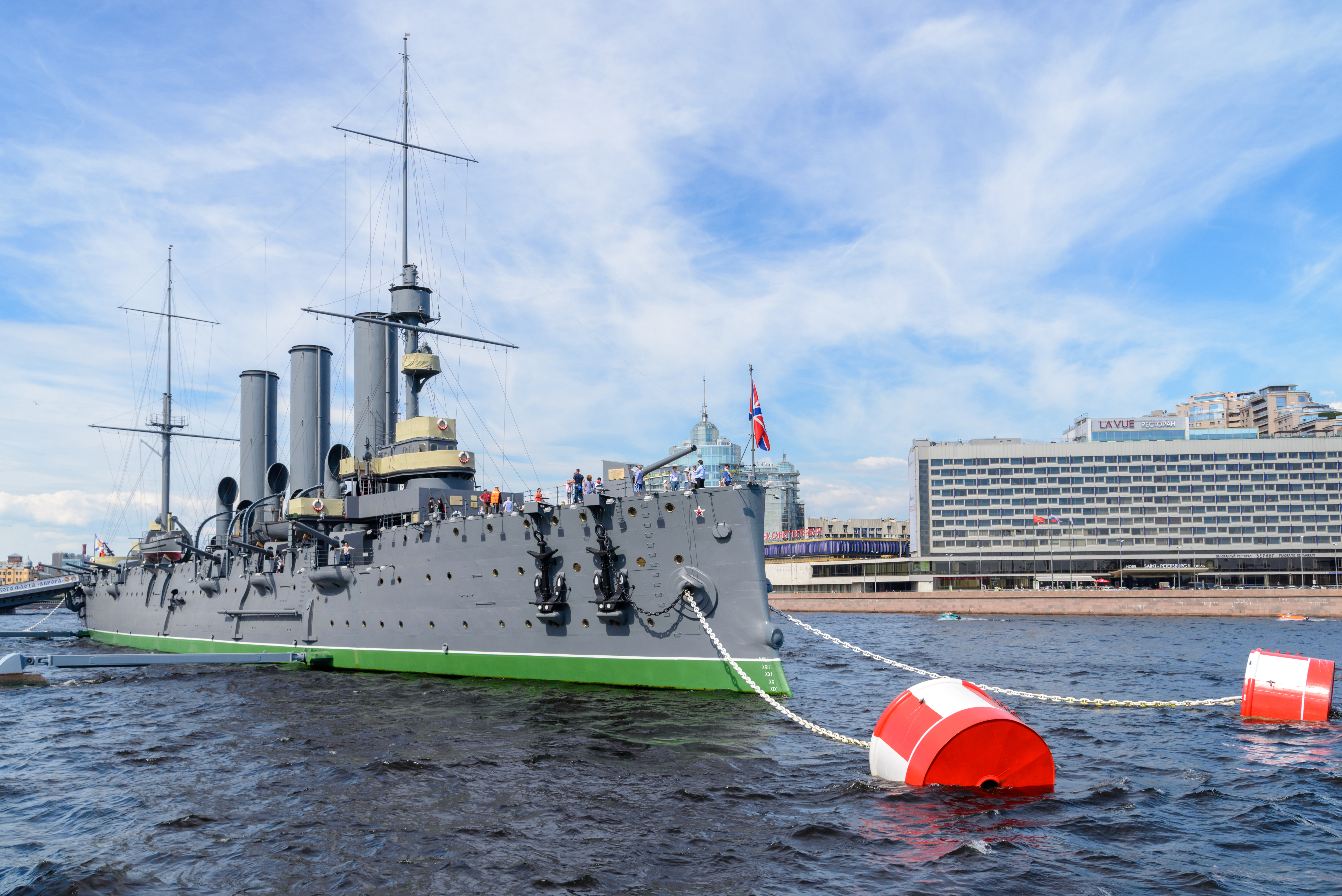 На переднем плане красуются два ярких буя, окрашенных в красно-белую полоску, которые служат ориентирами и подчеркивают водную гладь. Их контрастный цвет привлекает внимание, но не отвлекает от главного героя снимка – крейсера «Аврора».