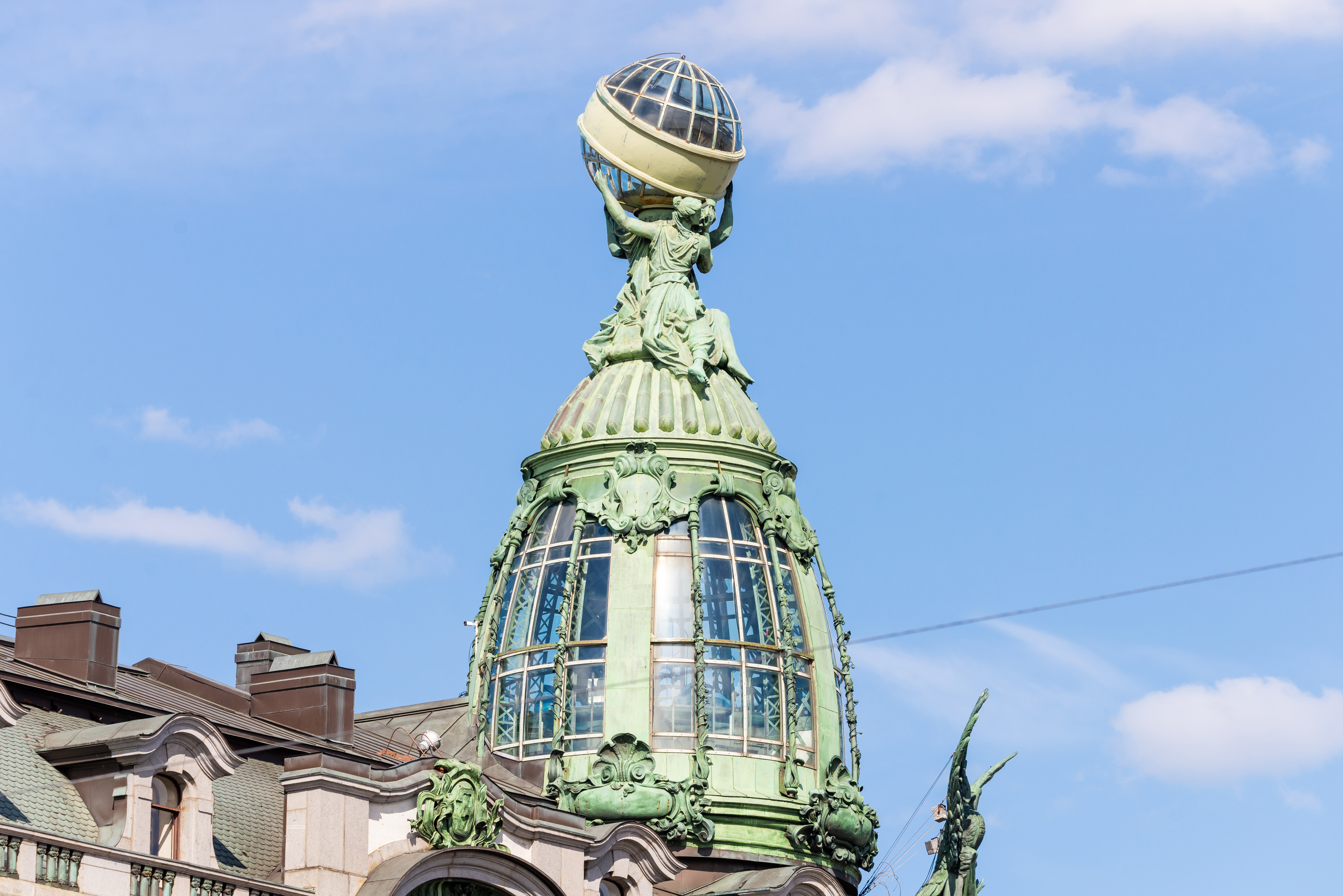 The first paragraph describes the majestic dome of the Azov-Don Bank Building in Saint Petersburg, which is a central architectural element in the ensemble. Built in the Art Nouveau style, this building stands on the Fontanka Embankment and is distinguished by its unique forms and details. The dome is adorned with intricate decorations that include the statue of Atlas holding a celestial globe, symbolizing global trade or historical connections between Europe and Asia. Surrounding the building, the Fontanka River creates a striking contrast between the stillness of architecture and the dynamism of water.