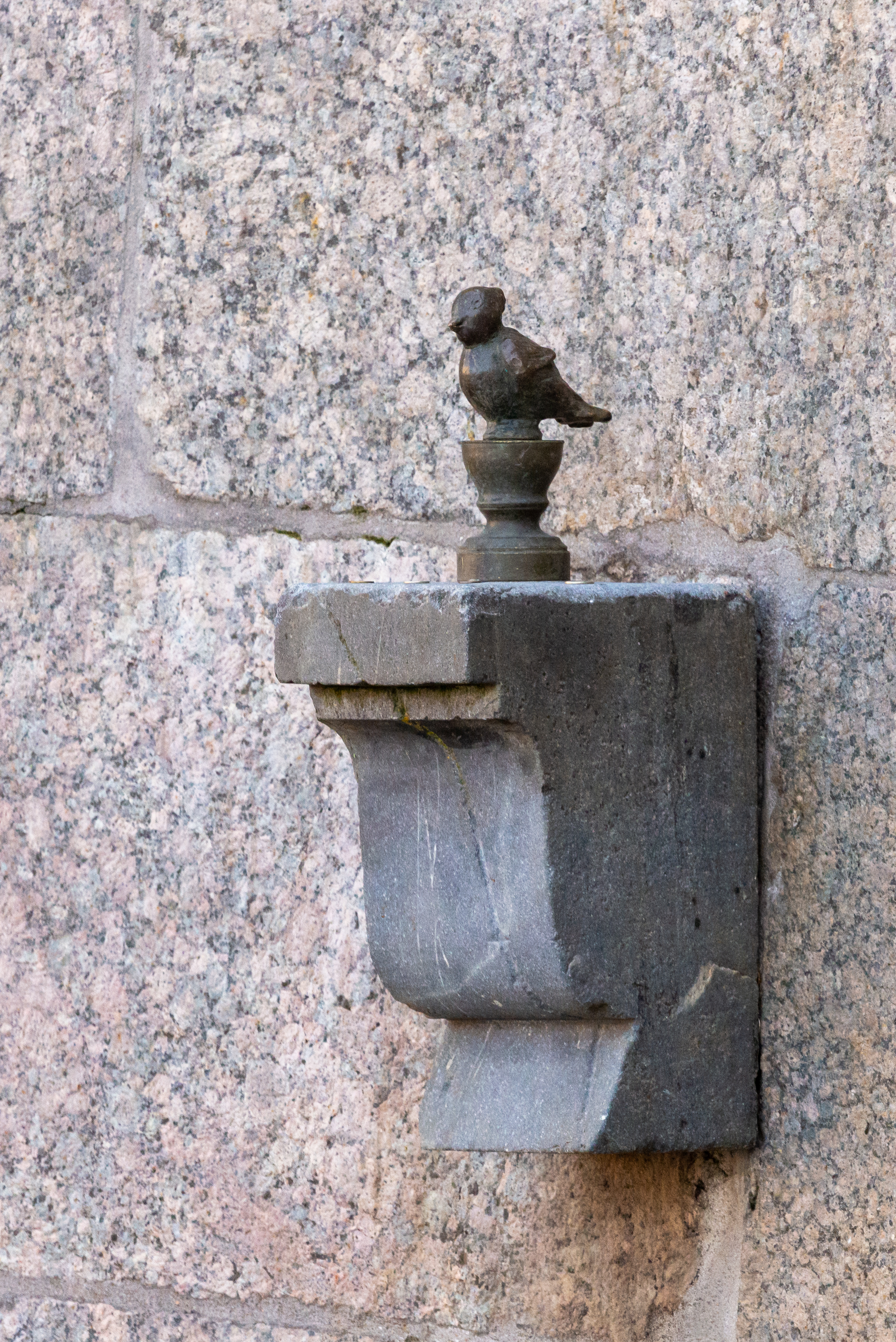 The composition of the shot focuses on the monument itself, which is mounted on a massive stone ledge attached to a wall made of coarse-grained pinkish-gray granite. The small bronze figurine of the bird, Chizhik Pyzhik, sits on a pedestal, turning its head to the side. Its miniature size contrasts with the monumentality of the surrounding stone masonry, creating a sense of fragility and charm.