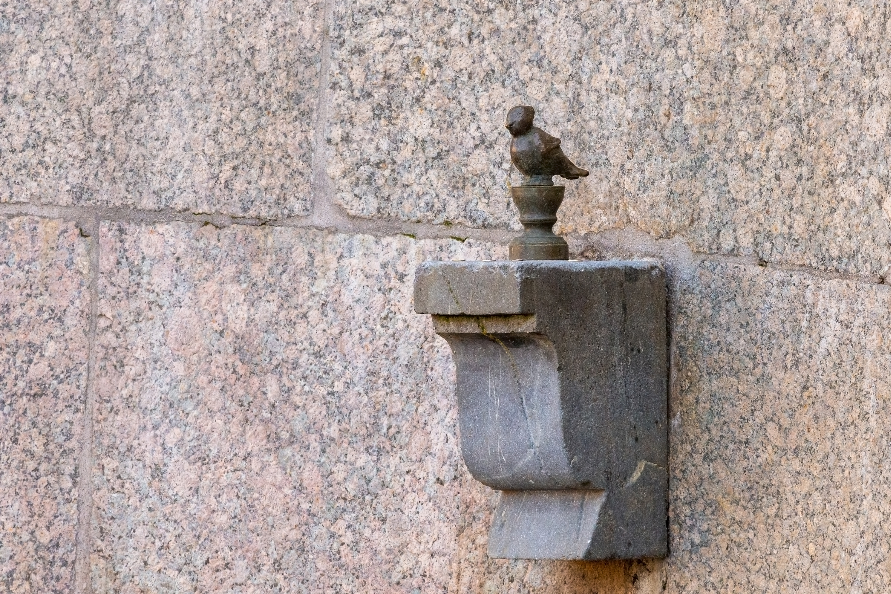 Освещение в кадре нейтральное, дневное, без резких теней, что позволяет рассмотреть все детали памятника и его окружения. Цветовая палитра снимка состоит из натуральных оттенков гранита — розовых, серых и бежевых тонов, гармонично сочетающихся с бронзовым цветом птички. Общее настроение фотографии — спокойное и умиротворенное, передающее ощущение исторического центра Санкт-Петербурга, где каждый уголок хранит свою уникальную историю и очарование. Этот памятник является популярным местом у туристов и местных жителей, приносящим удачу и исполняющим желания.