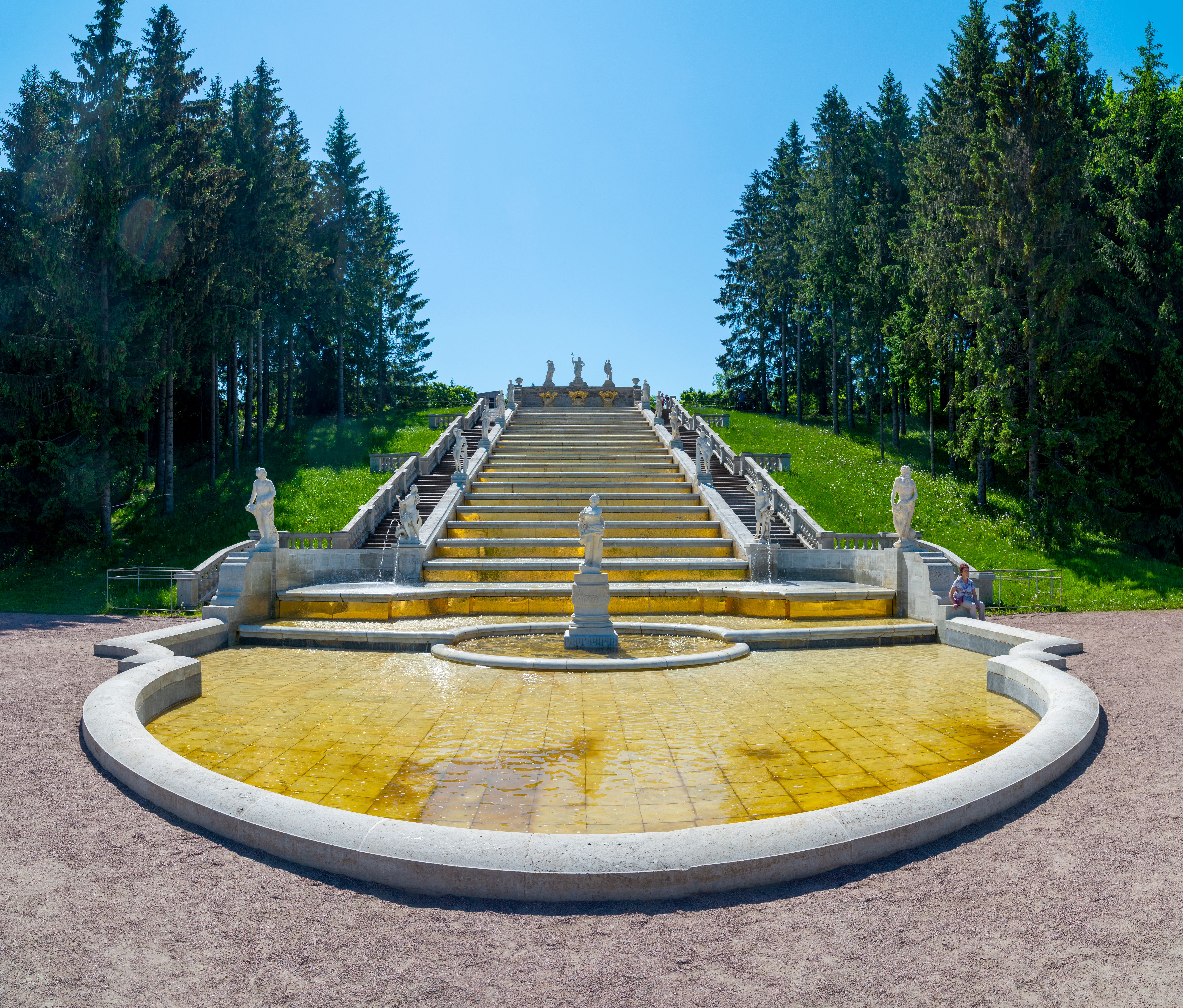 Tall, slender fir trees, framing the cascade on both sides, create a contrast between the man-made beauty of the park and the natural landscape. Their dark green against the bright blue sky gives the image depth and volume. Green, well-maintained lawns on the hillsides add freshness and picturesque quality.