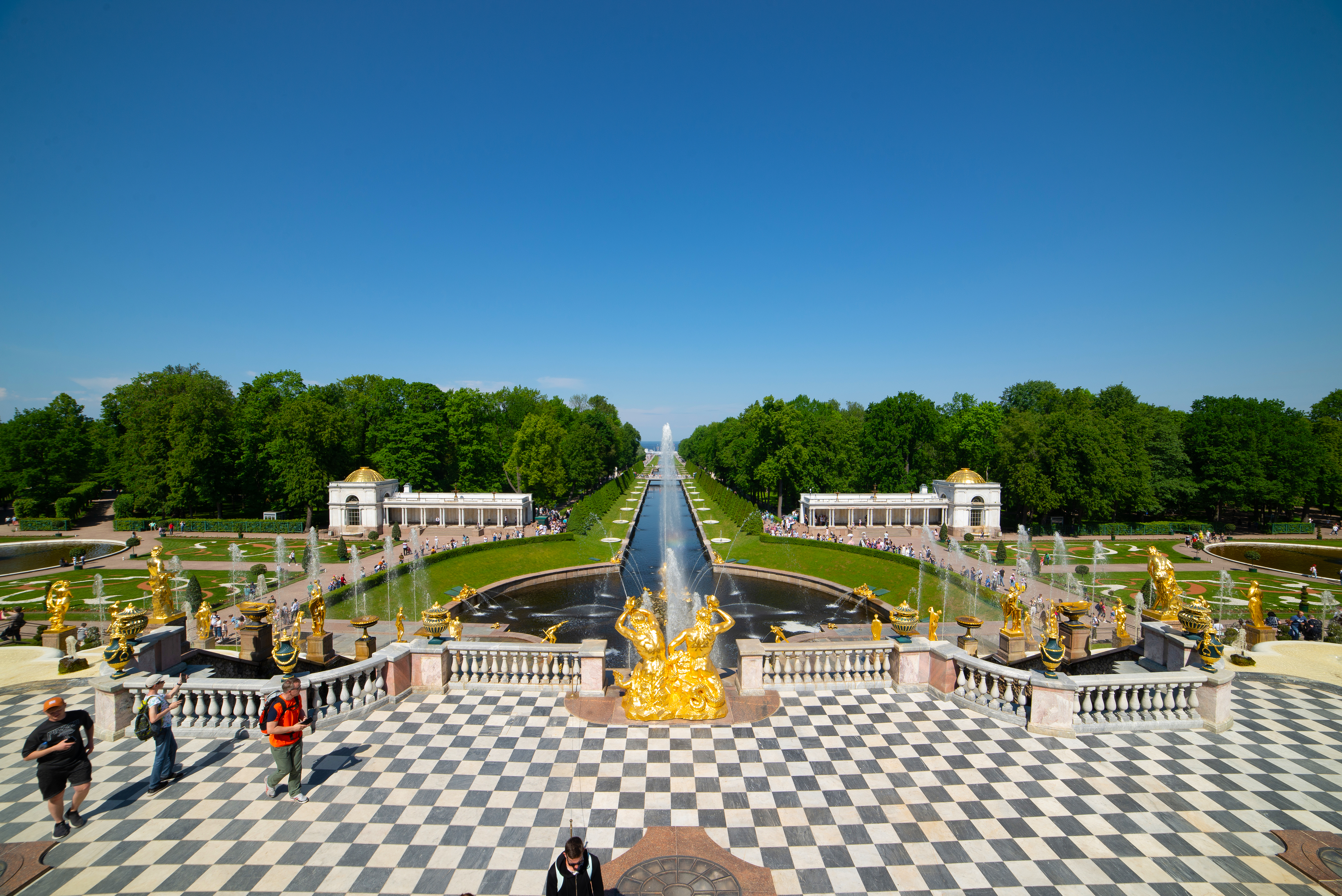 Композиция снимка выстроена с акцентом на перспективу, ведущую от монументальной лестницы с шахматным узором к бесконечному Большому каналу, уходящему к горизонту. На переднем плане видны отдыхающие посетители, наслаждающиеся красотой парка, их фигуры создают ощущение жизни и масштаба. Золотые статуи, украшающие каскад, сверкают на солнце, добавляя роскоши и исторического колорита.