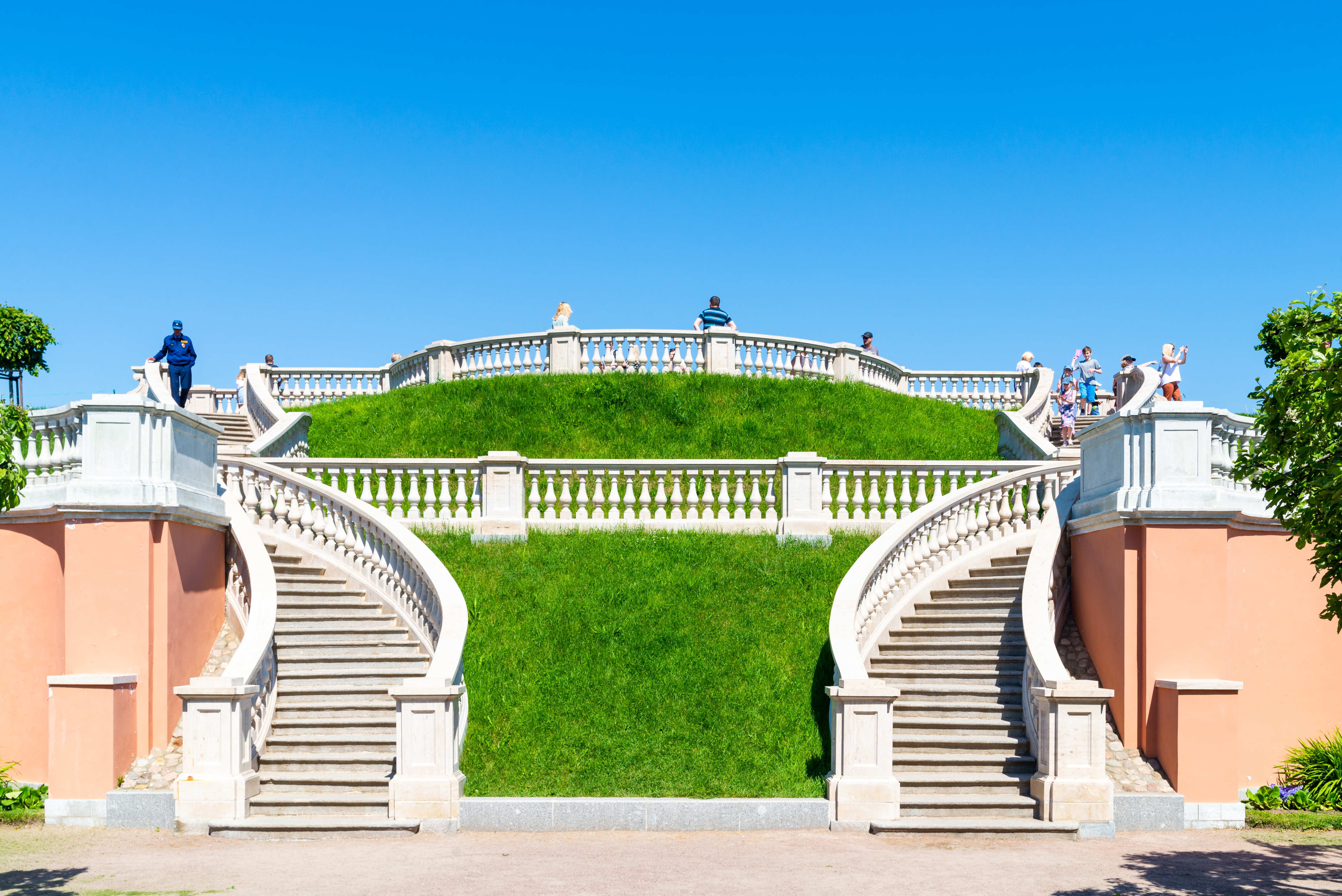 The composition is meticulously arranged, guiding the viewer's gaze along the curves of the staircase, leading them to the summit and the unfolding scenic vista. The vivid colors – the rich green of the grass, the deep blue of the sky, and the light tones of the architecture – create a cheerful and positive mood. This shot perfectly captures the essence of summer relaxation, peace, and the beauty of nature harmoniously blended with human artistry.