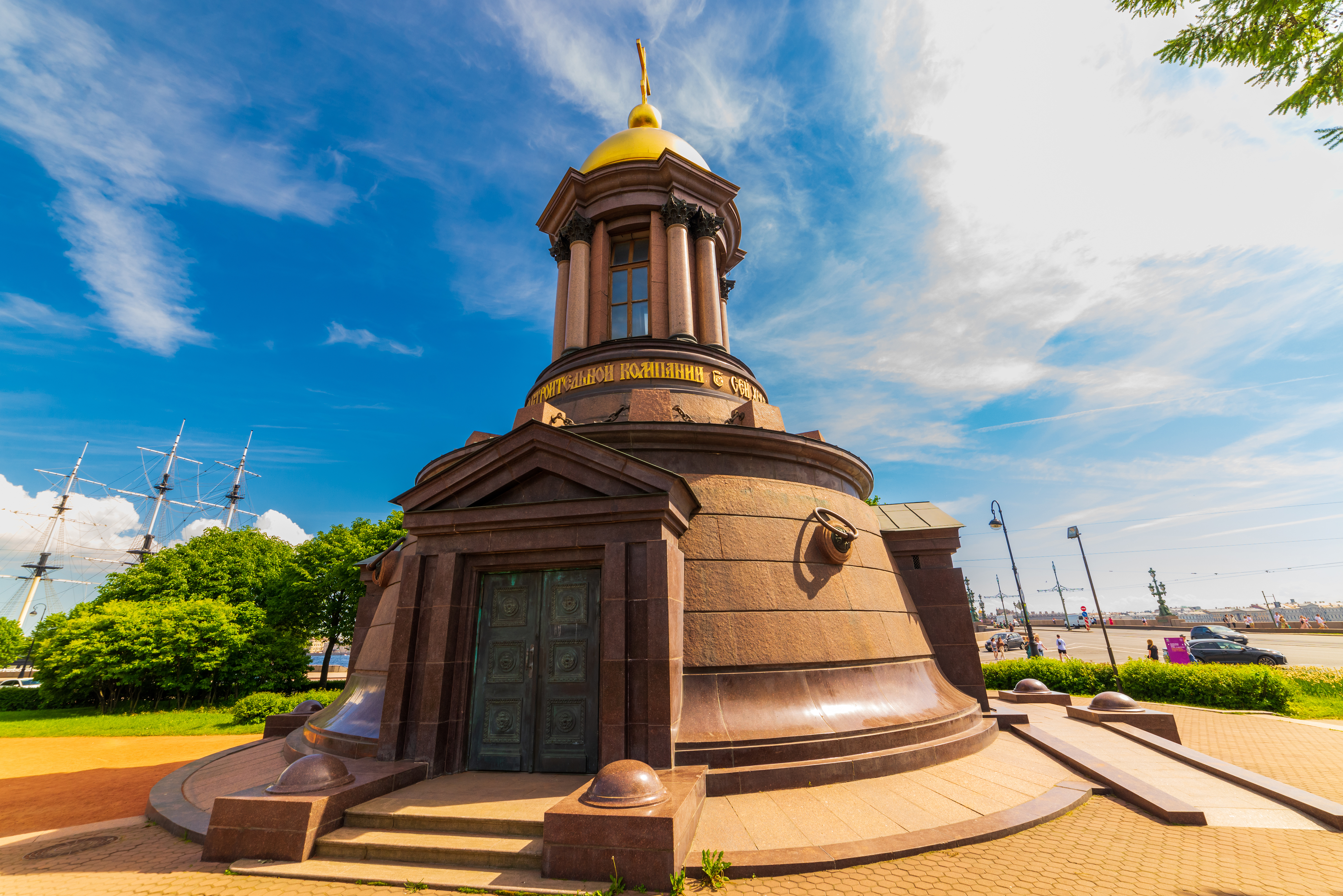 с описанием памятника «Слава Русской Гвардии» в Санкт-Петербурге. Этот монумент, стоящий среди городских зданий, является важным архитектурным элементом и символом исторической важности. Вид на памятник с золотым куполом придает ему особое величие и торжественность. Голубое небо с белыми облаками создает контраст, который усиливает эмоциональную нагрузку изображения, делая его привлекательным для зрителей.