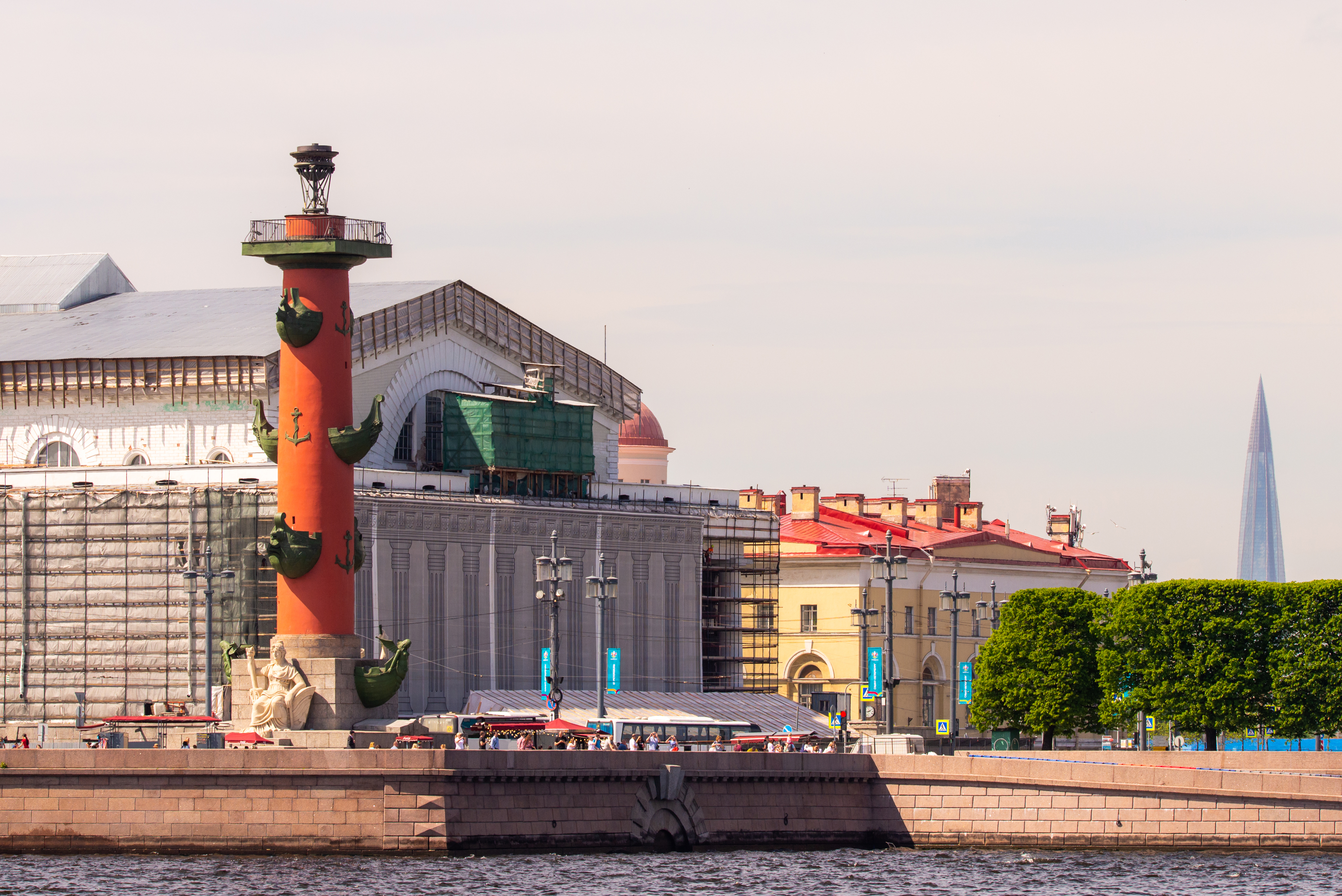 In the foreground is the iconic Rostral Column towering over historic buildings in St. Petersburg's heart. In the distance are clearly visible modern structures such as Lakhta Center and skyscrapers of contemporary architecture. The sunny day creates a vivid contrast, with warm golden hues of the shining sun blending with cool blue tones of the sky and cityscape. At the center of the image is the bronze statue on the Rostral Column, drawing the viewer's gaze to the horizon where ships are seen sailing in the sea. This composition combines historical and modern architectural elements, creating a picturesque view of St. Petersburg. The clear skies devoid of clouds lend the scene freshness and purity. Overall, the scene exudes light and joy, evoking feelings of freedom and enjoyment of the city's beauty.