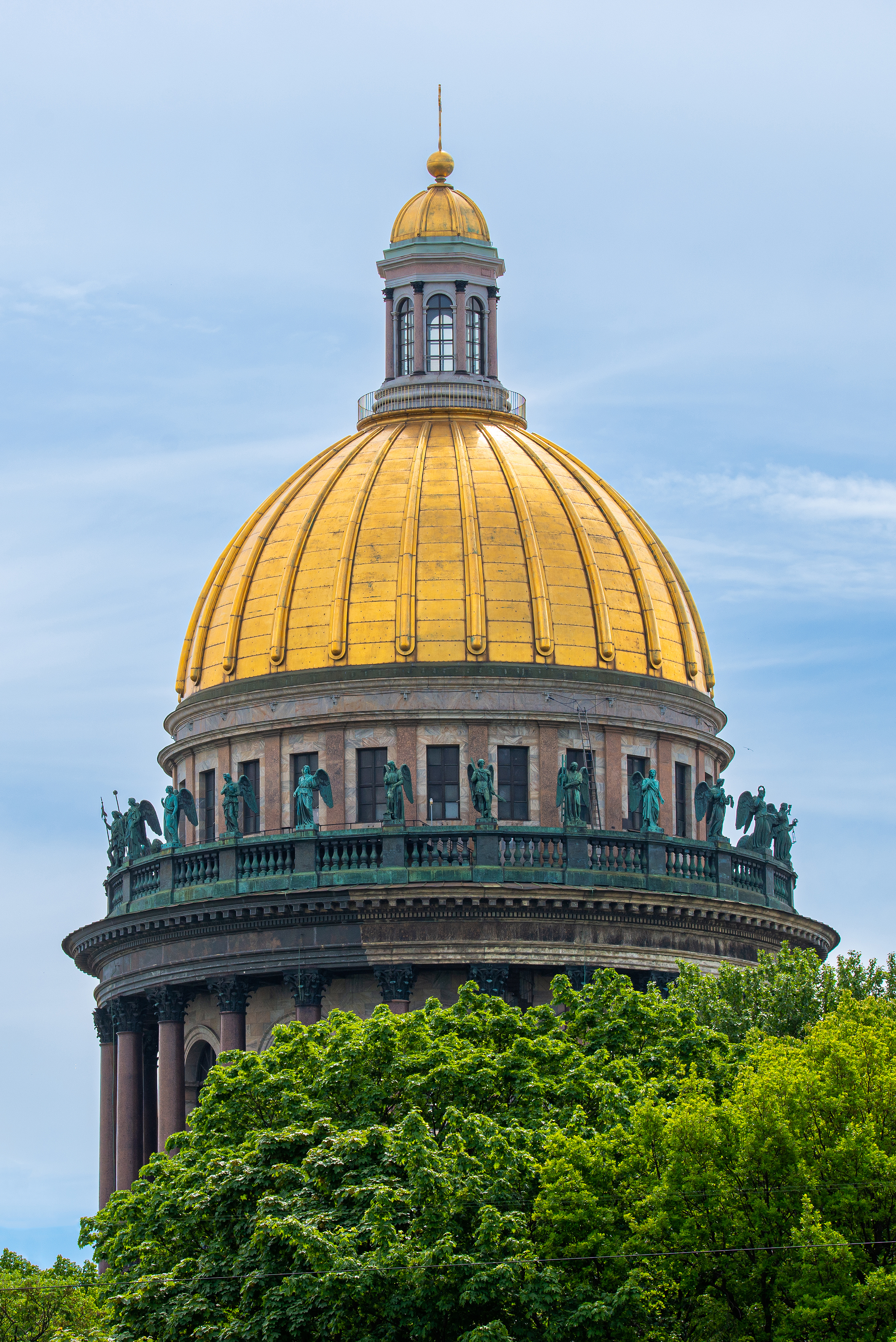 Вид на Исаакиевский собор в Санкт-Петербурге, Россия, на фоне весеннего неба и зеленых деревьев. Солнечный свет создает мягкий подсвет, акцентируя лепные статуи и золоченный купол собора. Вокруг собора проходит пешая улица, по которой гуляют люди в легких весенних нарядах.