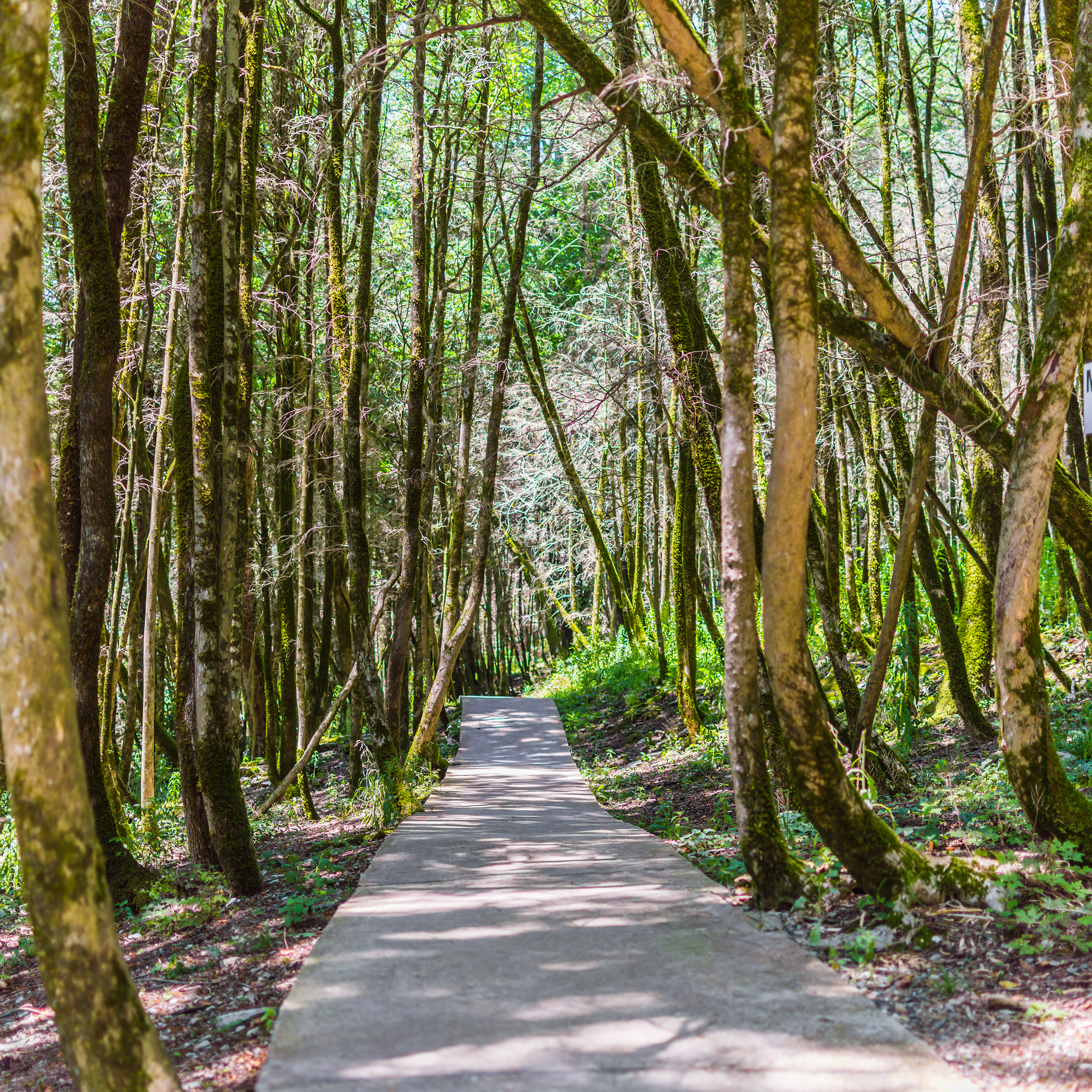 Это завораживающее изображение запечатлевает спокойную тропинку, уходящую между высокими деревьями, покрытыми мохом. Густая крона сверху фильтрует солнечный свет, создавая пятна тени на гладкой бетонной дорожке, что образует завораживающий эффект взаимодействия света и тени. Сцена размещена в дневное время, вероятно летом, когда ярко-зеленая растительность доминирует визуальное пространство. Вертикальные линии, образованные стволами деревьев, направляют взгляд зрителя по тропинке на расстояние, усиливая глубину и перспективу.