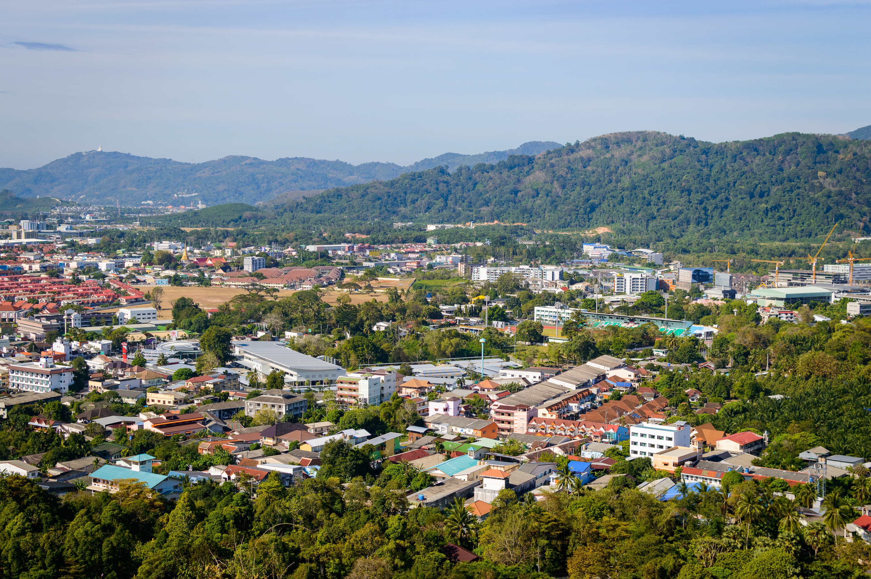 This breathtaking aerial photograph captures the picturesque town of Phuket as seen from the Khao Rung viewpoint, offering a sweeping panorama that encompasses both natural beauty and urban development. The image reveals a vibrant mix of residential neighborhoods with colorful rooftops, modern buildings, and construction cranes indicating ongoing growth, all set against a backdrop of lush green hills and dense tropical forest. The clear blue sky above enhances the vividness of the scene, while sunlight bathes everything in warm tones that emphasize textures from smooth concrete to rough tree bark. This high-angle perspective allows viewers to appreciate the town's layout as it winds through valleys and slopes, blending seamlessly with its natural surroundings.