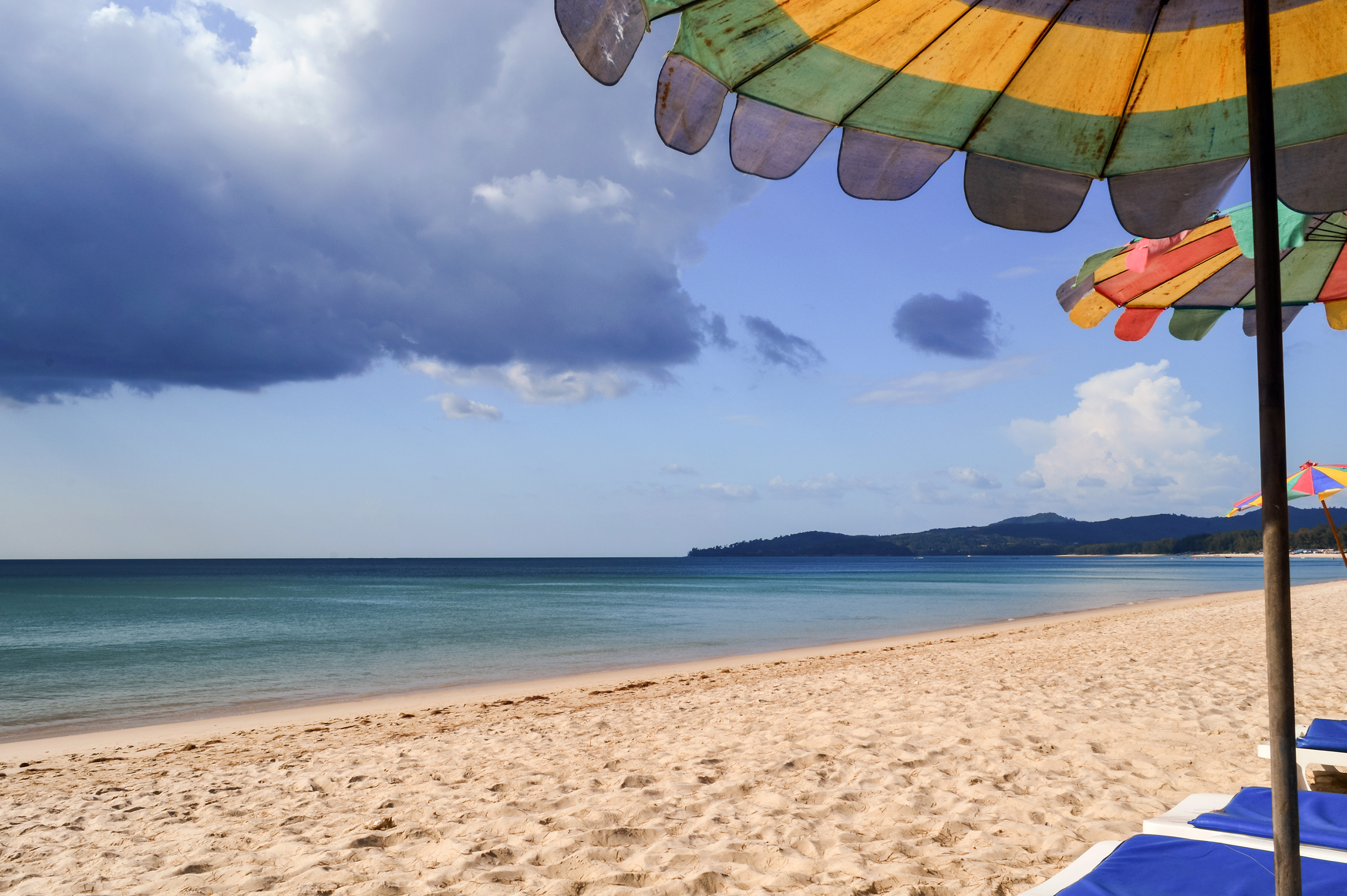 Это захватывающее изображение запечатлело спокойный тропический пляж, где яркий многоцветный зонт выступает как впечатляющий передний план. Небо над ним драматично разделено: одна сторона освещена ясным голубым цветом с мягкими белыми облаками, а другая — показывает приближающиеся грозовые облака, намекающие на предстоящее изменение погоды. Бирюзовое море тянется к горизонту, встречающееся с далеким зеленым холмом под огромным небесным пространством. Мелкие зерна золотистого песка покрывают передний план, перекрываясь только основанием зонта и намеками на синие шезлонги рядом. Композиция использует край зонта как естественную рамку, направляя взгляд зрителя в сторону спокойного, но динамичного пейзажа за пределами. Освещение мягкое и рассеянное, создает легкие тени и подчеркивает богатые текстуры: от потертого холста зонта до гладкости влажного песка у береговой линии.