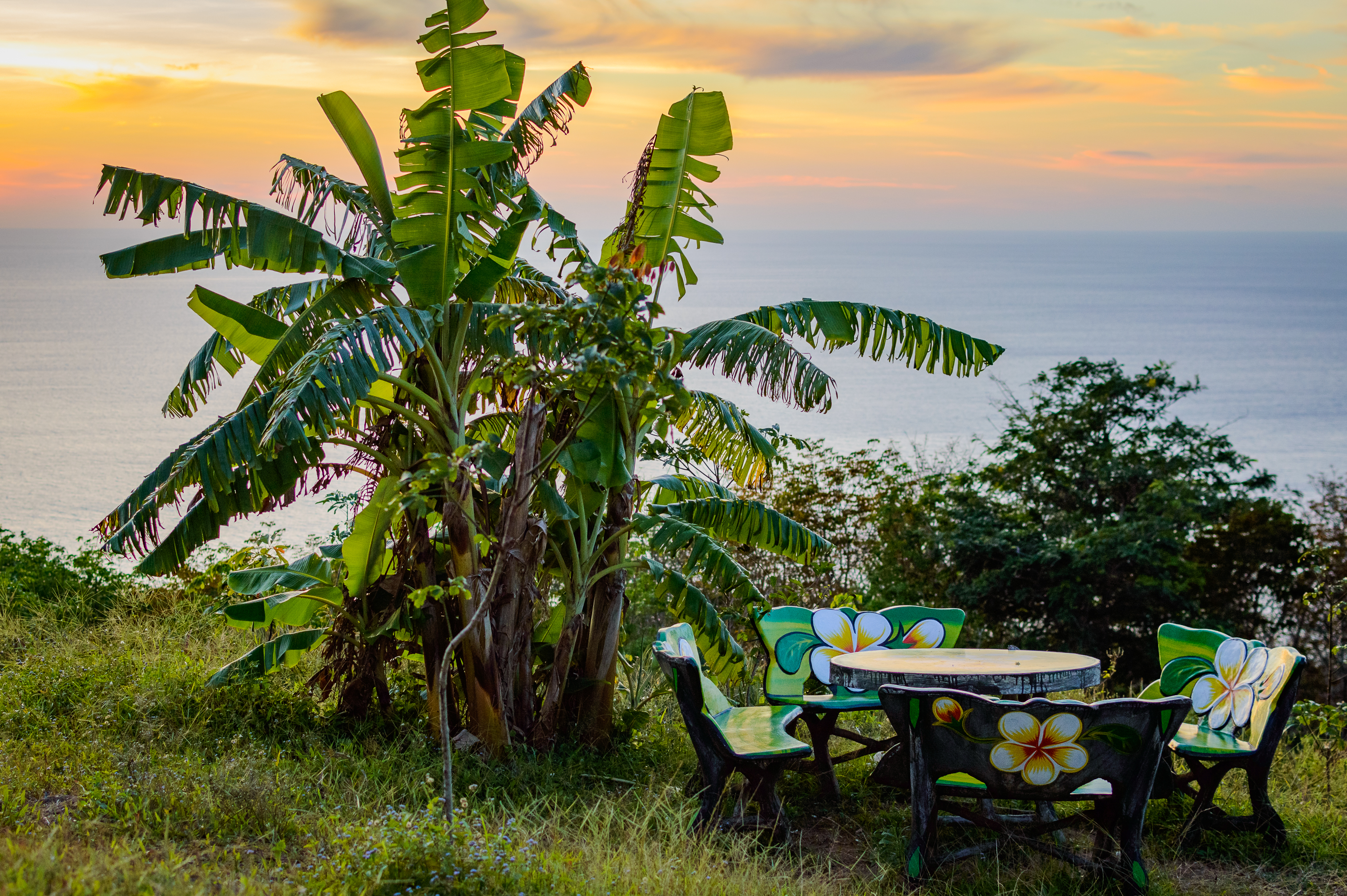 Это захватывающее изображение показывает уютную открытую зону отдыха на фоне великолепного морского заката. Сцена разворачивается на травянистом склоне, смотрящем на спокойное море, где тропические растения — включая большое банановое дерево — обрамляют композицию из густой зелени. Маленький патио столик с цветочными стульями, украшенными узорами, приглашает к отдыху и разговору под тёплым светом заходящего солнца. Золотое освещение мягко отражается на поверхности воды, усиливая спокойную атмосферу и бросая длинные тени на травянистую местность. Этот идеальный прибрежный отдых воплощает умиротворение и естественную красоту, идеально подходящий для расслабления после дня приключений или для романтических моментов в тропическом рафинаде.