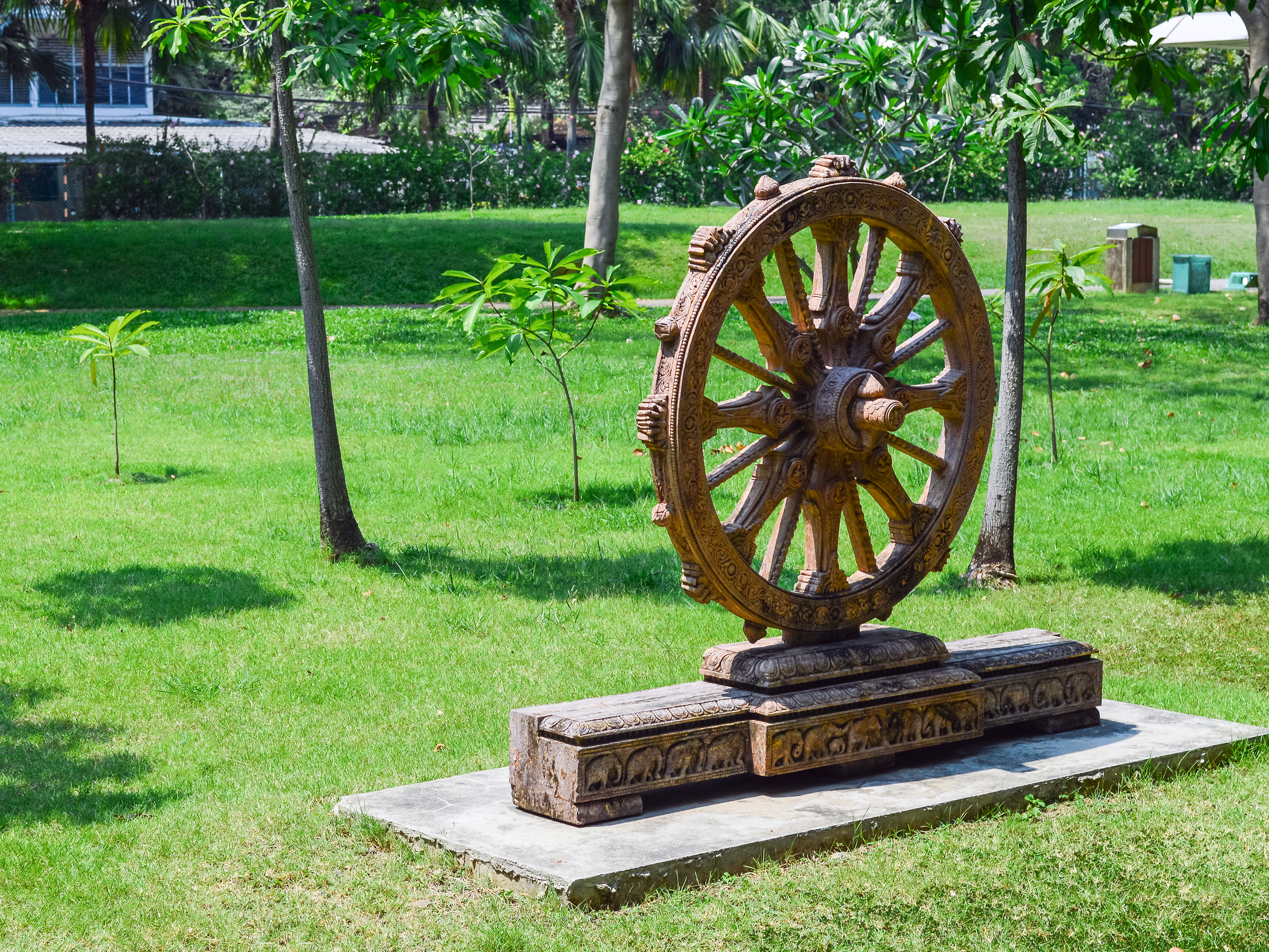 The visual details are striking: warm brown tones of aged wood contrast with the vivid green of the manicured lawn and the pale gray of the stone base. Each spoke of the wheel carries delicate carvings, adding texture and depth that invite closer inspection. The sunlight enhances these textures, creating highlights on raised surfaces and soft shadows in recessed areas, which emphasizes the three-dimensionality of both the sculpture and its surroundings. The background features a blend of mature trees providing natural framing and distant glimpses of urban structures, subtly reminding viewers of the monument’s location within a bustling city park. The overall aesthetic is one of timeless peace, where ancient spiritual symbolism meets contemporary urban green space.