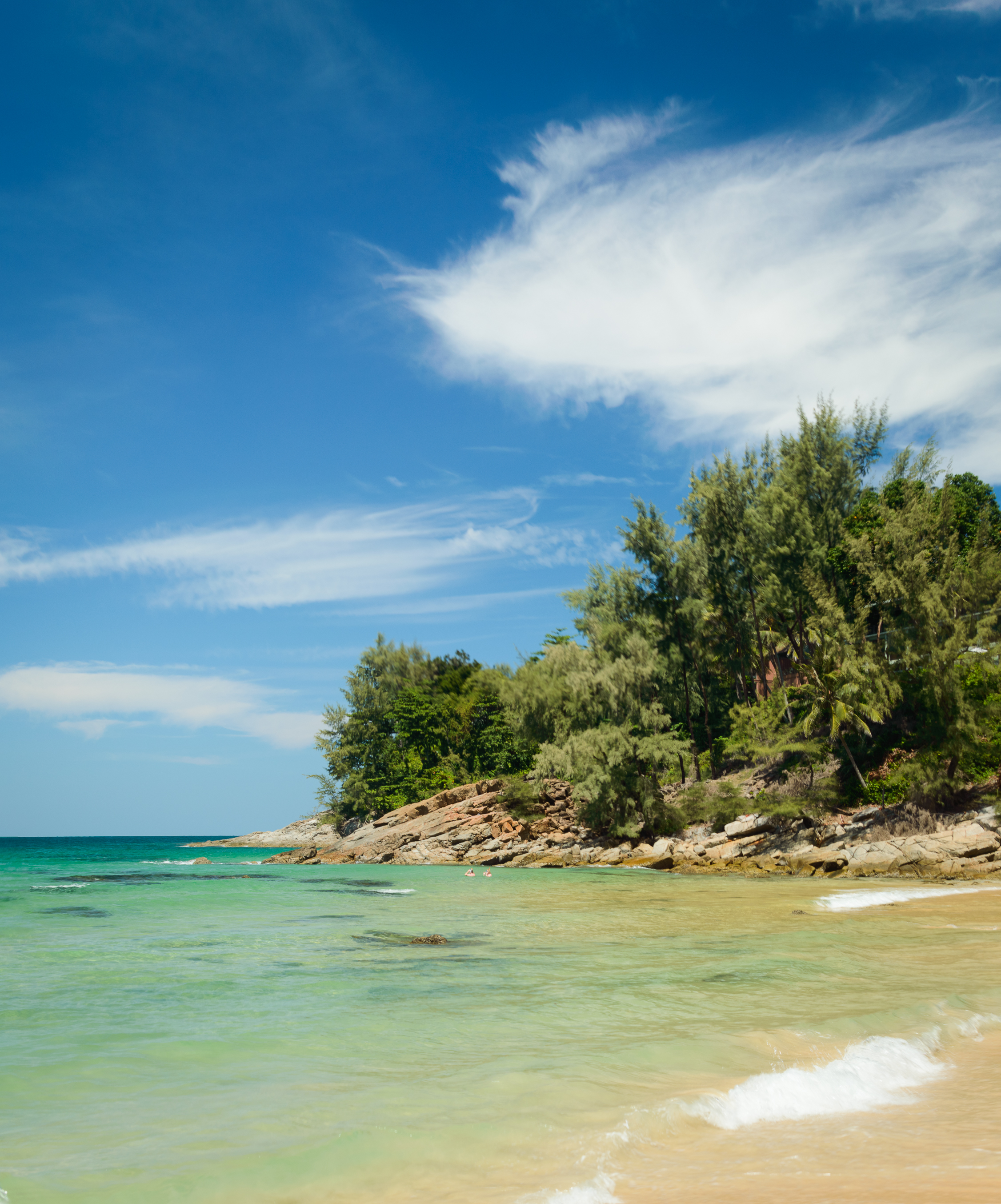 This stunning photograph captures the breathtaking beauty of Naithon Beach on Phuket Island, Thailand. The scene unfolds under a vast, vivid blue sky adorned with delicate white clouds that drift lazily overhead. Turquoise waters gently lap against a golden sandy shore, creating an inviting and tranquil atmosphere perfect for relaxation or exploration. Lush green trees and dense foliage dominate the rocky coastline, adding depth and contrast to the composition. The vibrant colors of the sea, sand, and sky blend harmoniously, evoking a sense of serenity and escape from everyday life.
