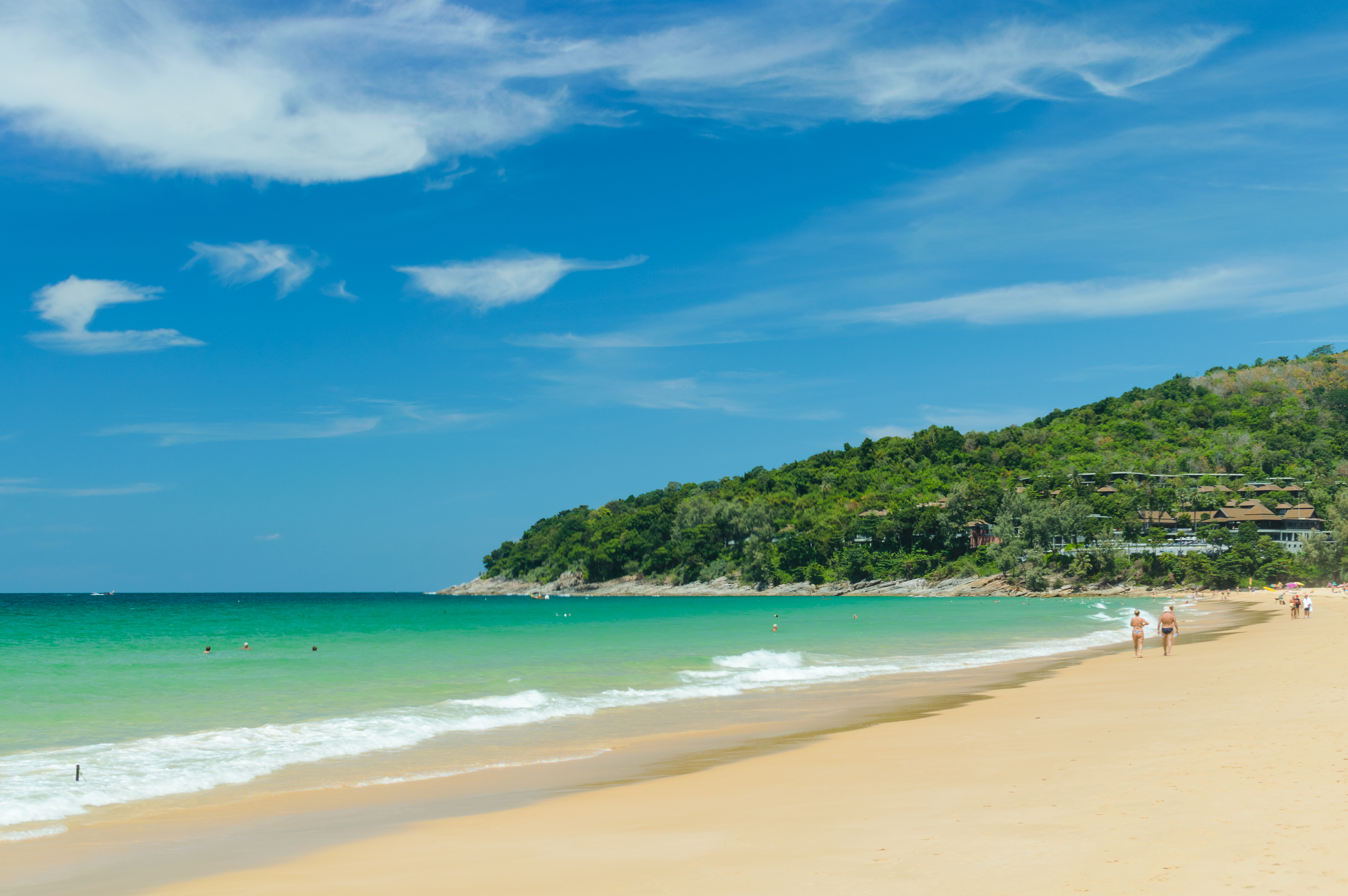 Naithon Beach, located on the picturesque Phuket Island in Thailand, offers a breathtaking tropical paradise. The scene unfolds under a clear blue sky with scattered white clouds, casting bright sunlight over the golden sandy shore and the vibrant turquoise waters of the Andaman Sea. Visitors can be seen enjoying various activities — some swim or float near the gentle waves while others stroll leisurely along the beach, soaking in the summer ambiance. The shoreline curves gracefully around lush green hills covered in dense tropical vegetation, where resort buildings peek through the foliage, indicating a blend of natural beauty and human development. This coastal landscape is ideal for relaxation and exploration, evoking feelings of peace, freedom, and escape from everyday life.