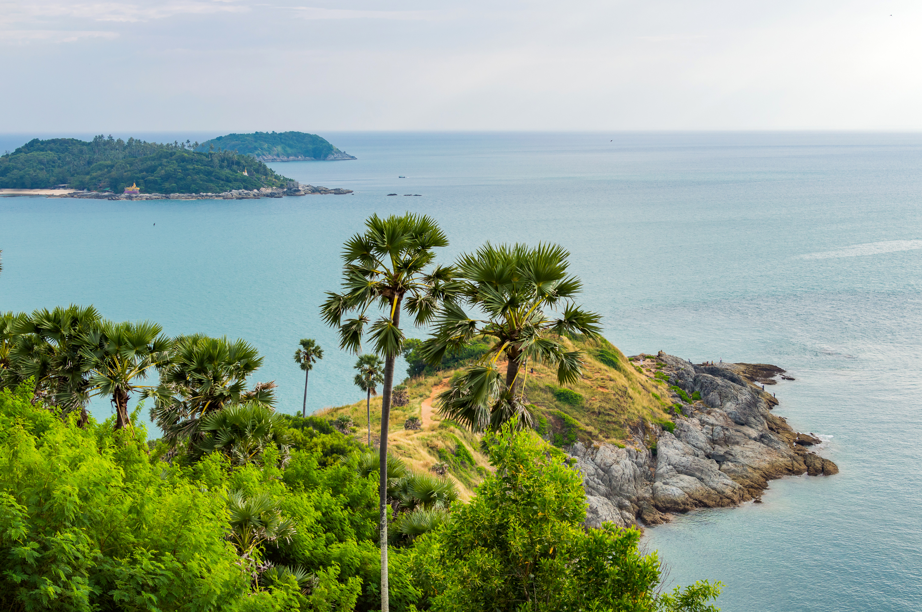 This breathtaking image captures the serene sunset view from Phromthep Cape, a famous viewpoint on the island of Phuket, Thailand. The scene unfolds with lush green palm trees in the foreground, their fronds swaying gently against a backdrop of rugged rocky cliffs that meet the calm turquoise waters of the Andaman Sea. In the distance, verdant islands rise from the horizon under an expansive sky transitioning into soft sunset hues. The composition balances natural elements: vibrant foliage, weathered stone textures, and the shimmering ocean surface reflecting fading sunlight. This tranquil setting evokes a sense of peace and untouched beauty, inviting viewers to imagine themselves in this tropical paradise. The golden hour light gently illuminates the landscape, casting long shadows and enriching colors, while creating an atmosphere that is both calming and deeply inspiring. Perfect for travel blogs, tourism marketing, or any project seeking to convey relaxation, natural splendor, and the allure of Southeast Asian coastal destinations.