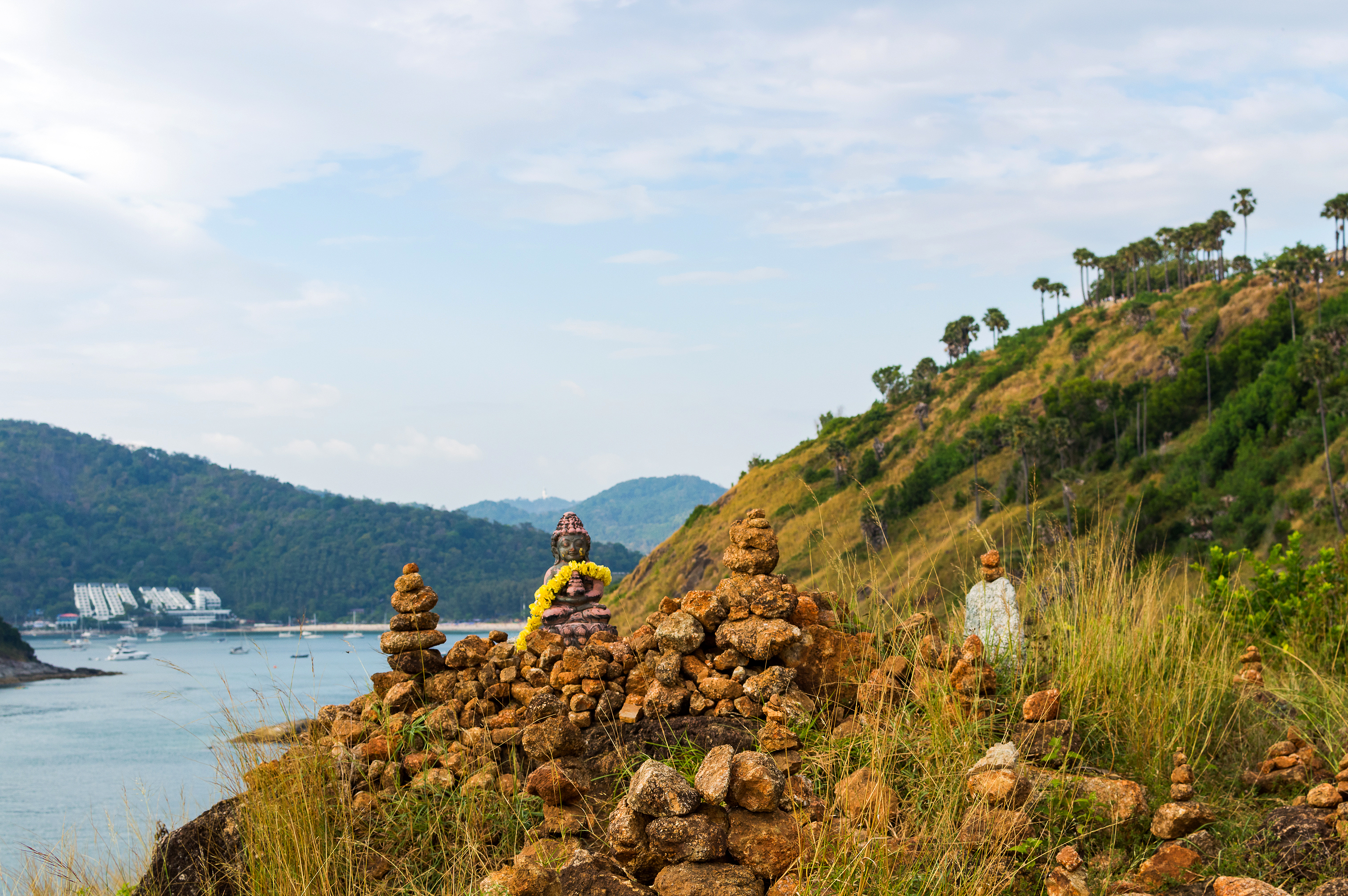Это захватывающее изображение отражает спокойную красоту мыса Фромтеп, знаменитого места на острове Пхукет в Таиланде. Сцена раскрывается с маленькой статуей Будды, украшенной яркими жёлтыми цветами, устроенной среди аккуратно сложенных каменных кучек, которые разбросаны по скалистому склону. На заднем плане зелёные холмы спускаются к спокойному заливу, где лодки мягко плывут рядом с современными зданиями отелей под частично облачным небом. Это место не просто красивое, но и глубоко духовное и культурно значимое как для местных жителей, так и для туристов.
