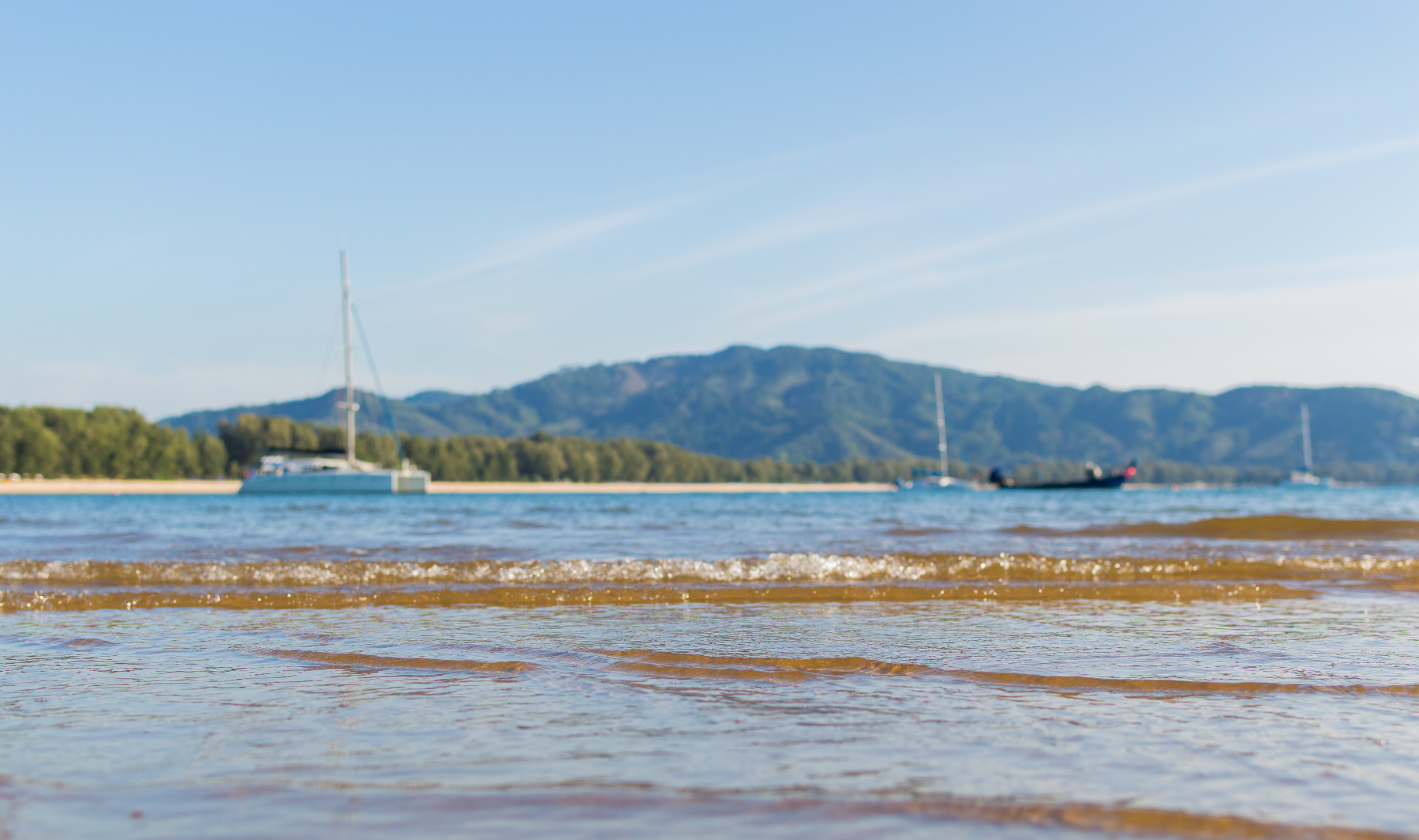 This captivating image captures a tranquil tropical beach scene at Bang Tao Beach, Phuket Island, Thailand. The foreground is dominated by shallow, gently rippling water with golden-brown hues reflecting the sunlight, creating an inviting and soothing visual effect. In the distance, several sailboats rest peacefully on calm waters, their masts standing tall against the backdrop of lush green mountains that stretch across the horizon. The sky above is a clear, vibrant blue, suggesting perfect weather for beach activities or quiet contemplation. This composition uses selective focus to blur the background while keeping the foreground water sharply detailed, drawing attention to the textures and movement of waves. The overall atmosphere evokes feelings of peace, relaxation, and escape from everyday life, making it ideal for travel-related content or promotional materials targeting vacation destinations.