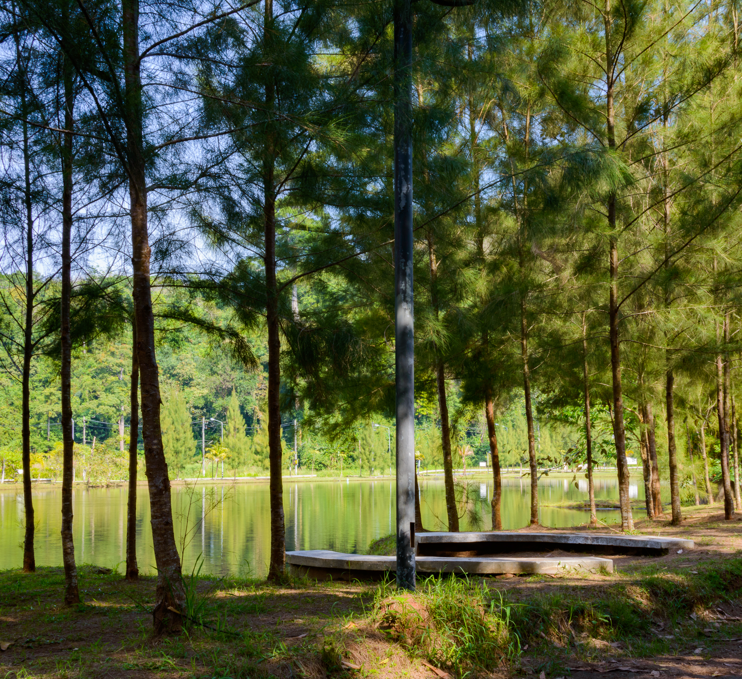 Это захватывающее изображение представляет собой спокойный тропический ландшафт, где тихое озеро окружено высокими соснами, создавая ощущение природного уединения и покоя. Сцена разворачивается под обширным синим небом без облаков, что указывает на ясный летний день. Солнечный свет пробивается сквозь густую крону деревьев, бросая сложные узоры пятнистых теней на землю под стволами деревьев, одновременно освещая участки живой зелени и земли. Простая деревянная скамья сидит приглашающе у самой воды, служа незаметным свидетелем тихой красоты этого нетронутого окружения. На заднем плане мягко поднимаются холмы, покрытые густой зеленью, идеально отражаясь в спокойной воде озера и усиливая глубину и мир в композиции.