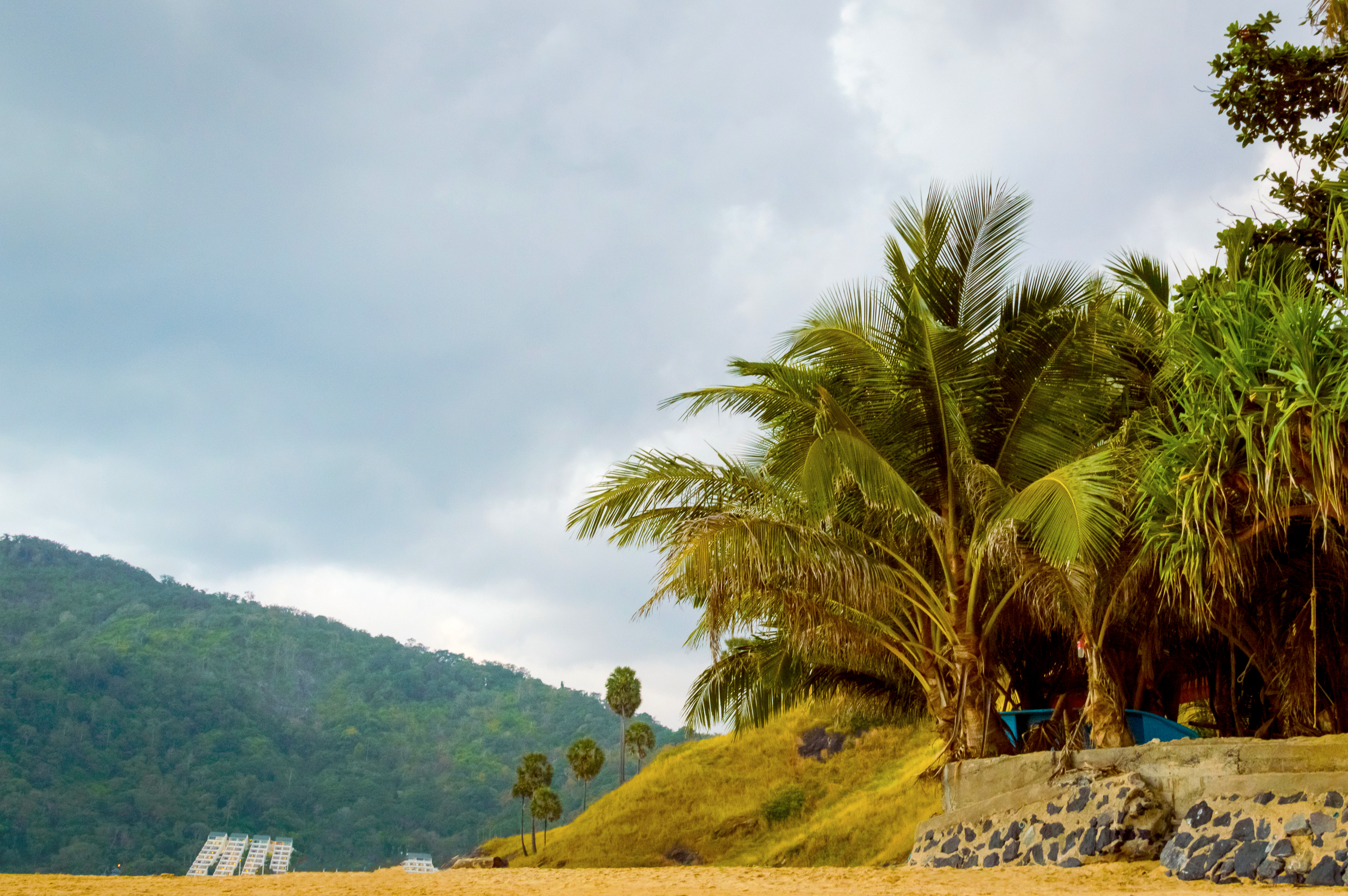 Визуальное согласие достигается благодаря тщательному балансу между элементами переднего плана, такими как грубые каменные стены и живые травянистые склоны, средним планом — деревьями с многослойными зелеными листьями, и задним планом — горами, покрытыми мохом и лесом. Палитра доминирует в теплых тонах — желтые оттенки песка, глубокие зеленые цвета растительности, а также приглушенные синие и серые тона неба — создают успокаивающую цветовую гамму, усиливающую ощущение спокойствия. Текстуры разнообразны: гладкий песок контрастирует с резкими каменными поверхностями, в то время как мягкие пальмовые листья добавляют легкое движение к статичности. Освещение рассеянное, что приводит к равномерному освещению без резких теней, подчеркивая форму вместо драмы.