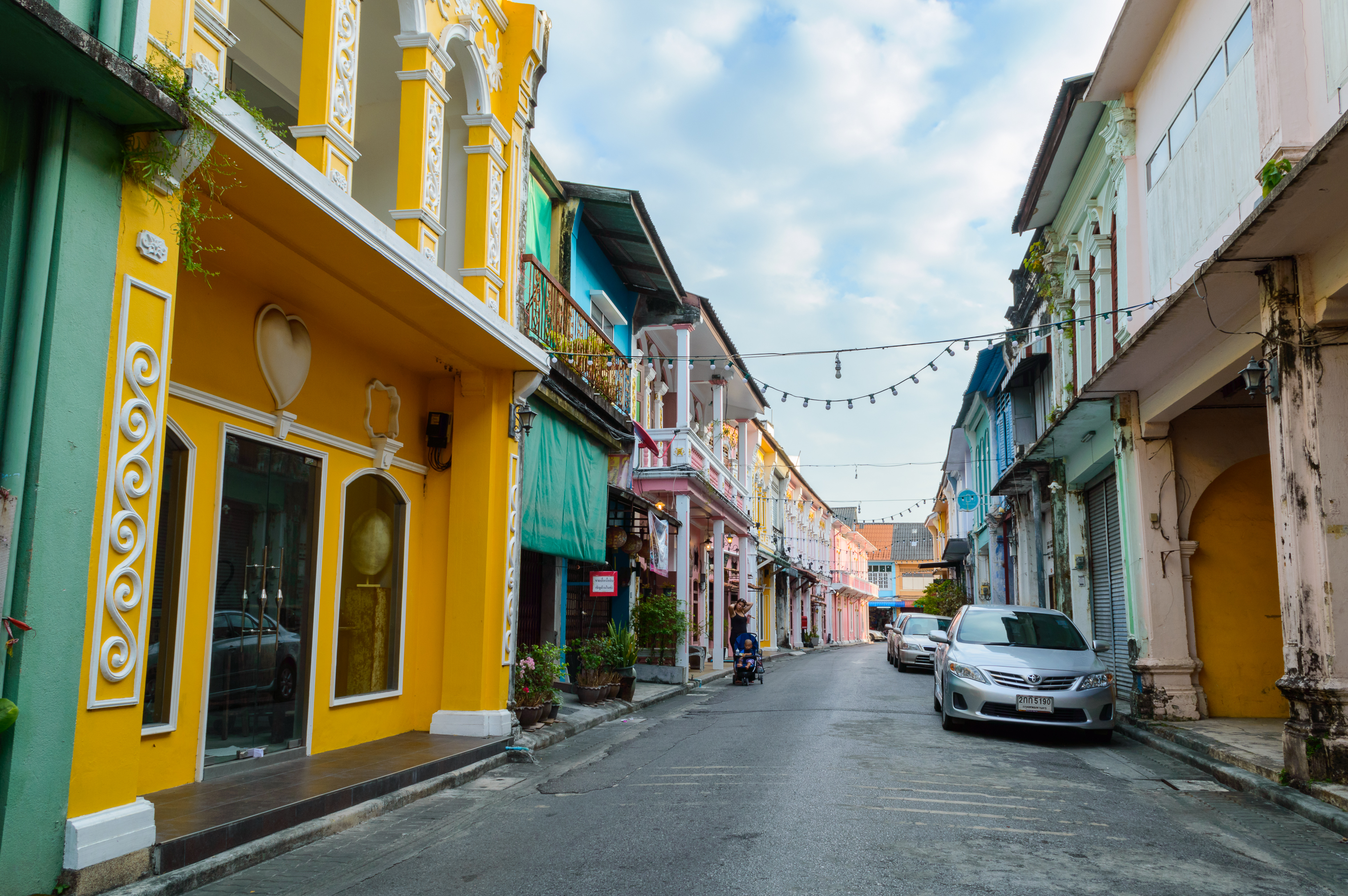 Погрузитесь в атмосферу исторического Пхукета, запечатленную 13 февраля 2017 года. Это изображение переносит нас на оживленную улицу старого города, где каждый фасад рассказывает свою уникальную историю. Доминируют яркие, насыщенные цвета: от жизнерадостного желтого, украшенного изящными лепными элементами и сердцем, до нежно-голубых и розовых оттенков, создающих живописную палитру. Здания, построенные в колониальном стиле с влиянием китайской архитектуры, демонстрируют богатое архитектурное наследие региона.