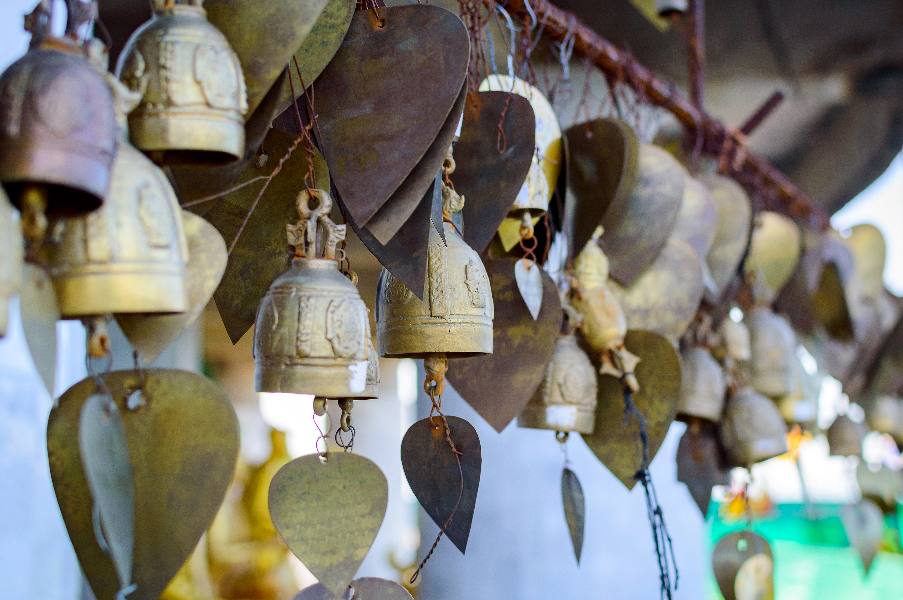 Эмоционально, это изображение наполняет спокойствием и тихим размышлениями. Зритель приглашается войти в священное пространство, где ритуальные объекты не просто эстетичны, но глубоко значимы. Есть медитативный характер покоя колокольчиков — предполагаемое движение их звонка с ветром добавляет динамическое напряжение без нарушения спокойствия. Сердца символизируют любовь, сострадание или личные желания — универсальная тема, резонирующая по всему миру. Тёплый цветовой палитра и мягкий фокус усиливают ощущение мира, делая это идеальным для дизайна проектов, направленных на спокойствие или духовную глубину. Художественно, это композиция, которая сочетает симметрию с органической вариацией, используя малую глубину резкости для изоляции предмета при сохранении контекста. Это фотография захватывает не только объекты — она заключает в себе верования, культурное наследие и человеческие эмоции через тщательно подобранные визуальные элементы.