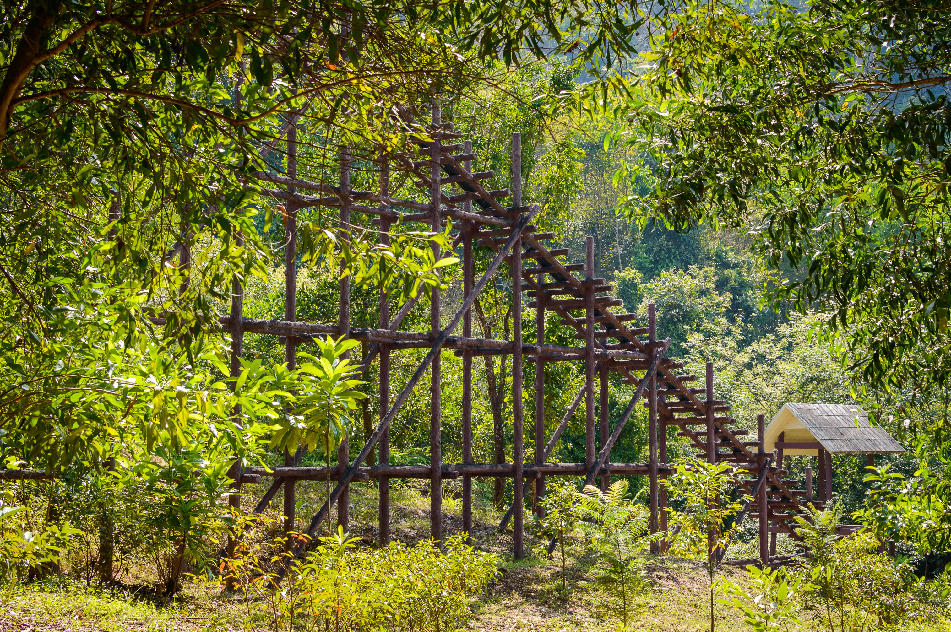 This captivating image showcases a weathered wooden conveyor structure nestled deep within a vibrant tropical forest. The scene unfolds under bright, natural sunlight that filters dramatically through the dense canopy of green leaves, casting dappled shadows across the rustic beams and steps. This industrial relic appears to be part of an old mining or logging operation, now reclaimed by nature but still standing as a testament to human ingenuity in rugged terrain. The surrounding environment is rich with diverse vegetation—lush ferns, young saplings, and towering trees create a layered backdrop that emphasizes the structure’s isolation within the wilderness. A small, simple wooden shed sits at the base of the conveyor, suggesting past utility or perhaps current use as an outpost.
