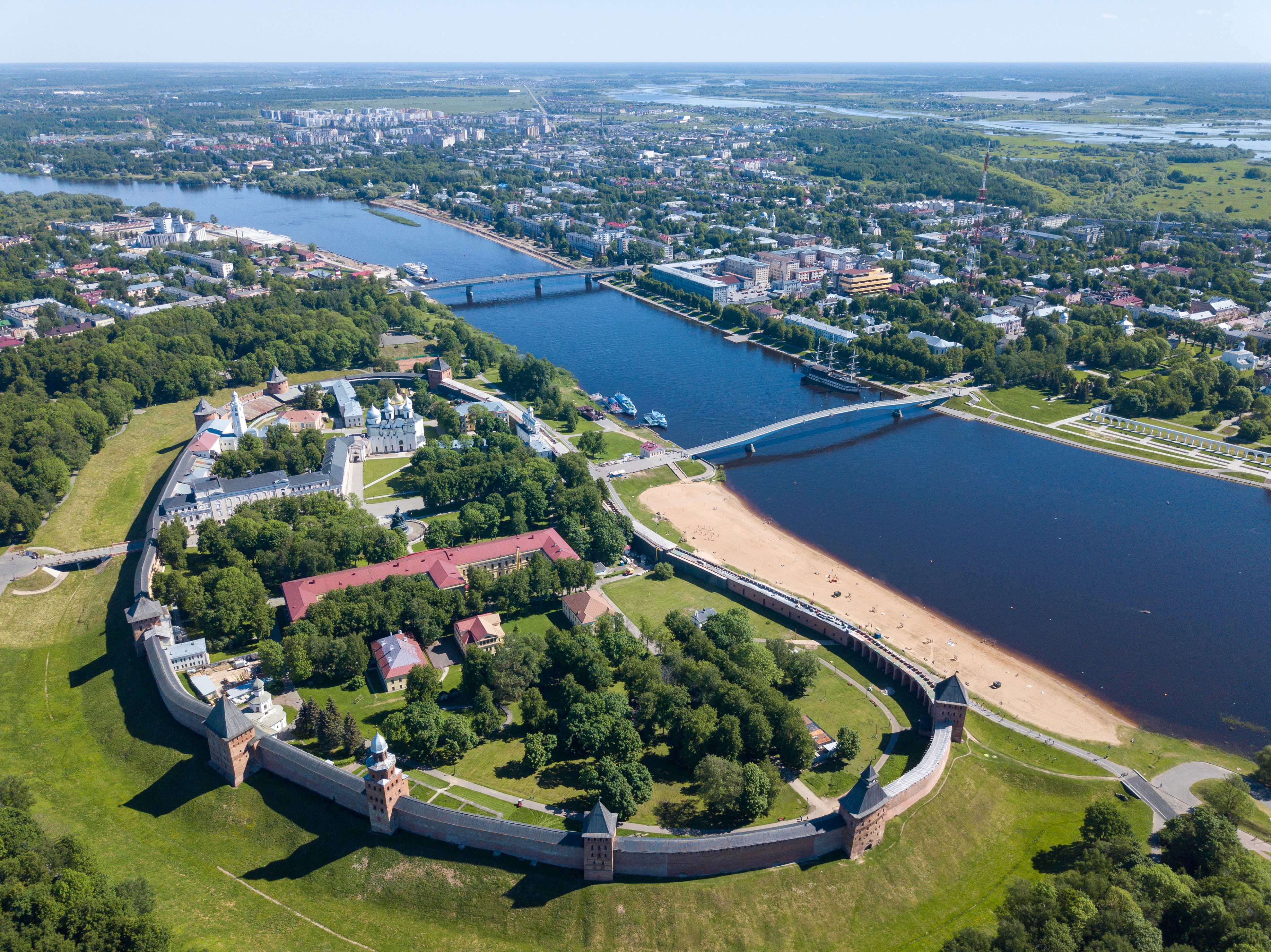 A majestic aerial view captures Velikiy Novgorod Kremlin – an ancient fortress rising above the picturesque banks of the Volkhov River in Russia. The camera, soaring high in the sky, showcases the scale and complexity of the architectural ensemble, a testament to the rich history of the city of Velikiy Novgorod. The panorama extends far beyond the fortress walls, encompassing tiled roofs of houses, a winding river, and vast expanses of Russian land. Time on the shot seems frozen – a quiet and peaceful summer day when the sun gently illuminates the ancient walls, and a light breeze plays with the foliage surrounding the Kremlin. This view gives a feeling of immersion in the past, allowing you to feel the breath of history and sense the connection between times.