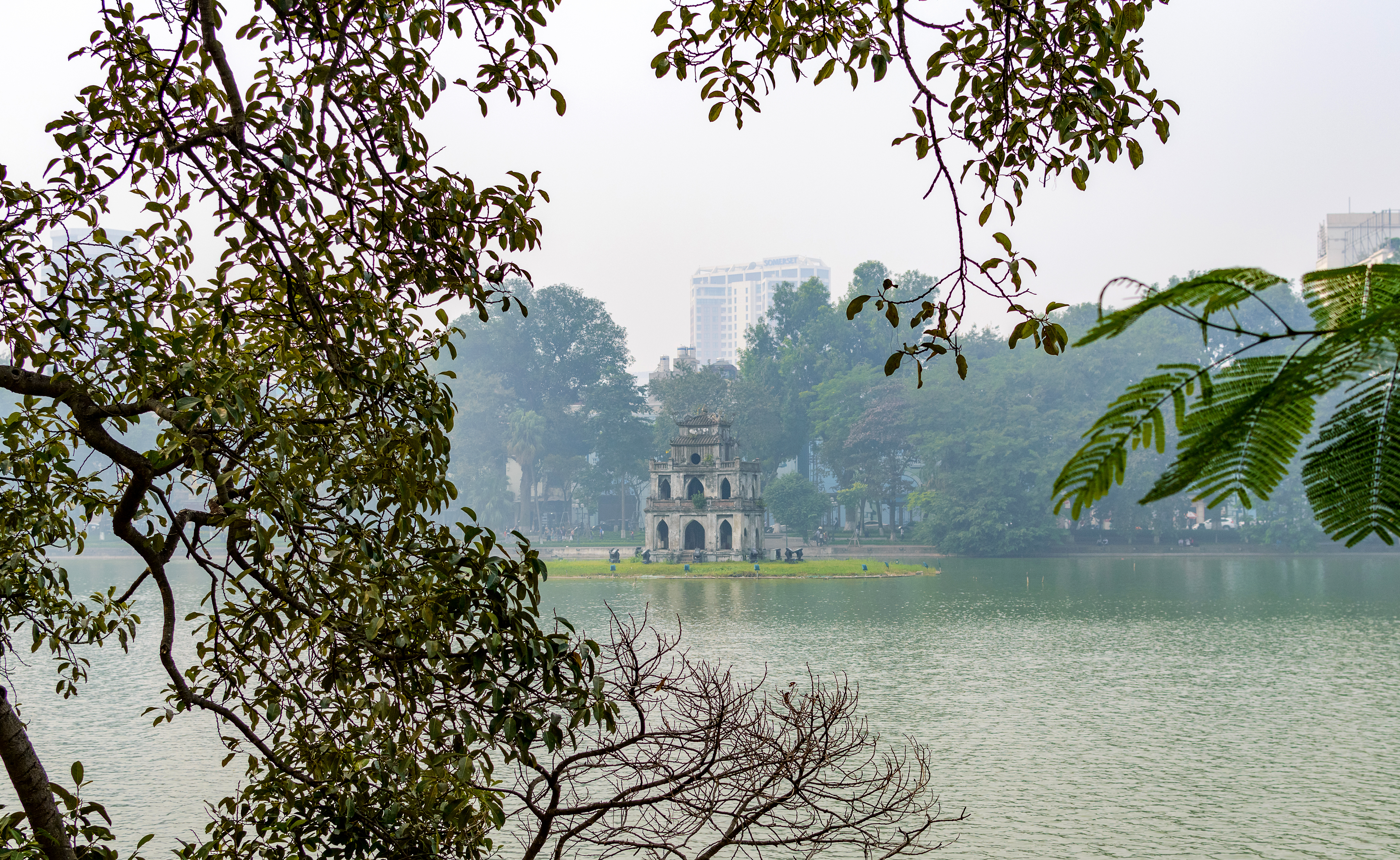 The composition of the shot is such that branches of trees in the foreground create a natural frame, focusing the viewer's attention on the main object – Ngoc Son Temple. Soft shades of green and gray dominate the image’s palette, conveying a sense of peace and melancholy. Soft diffused light emphasizes the texture of water and stone, creating a three-dimensional perspective. Elements of nature are present in the frame – leaves, branches, reflections in the water, which add pictoriality and naturalness to the shot.