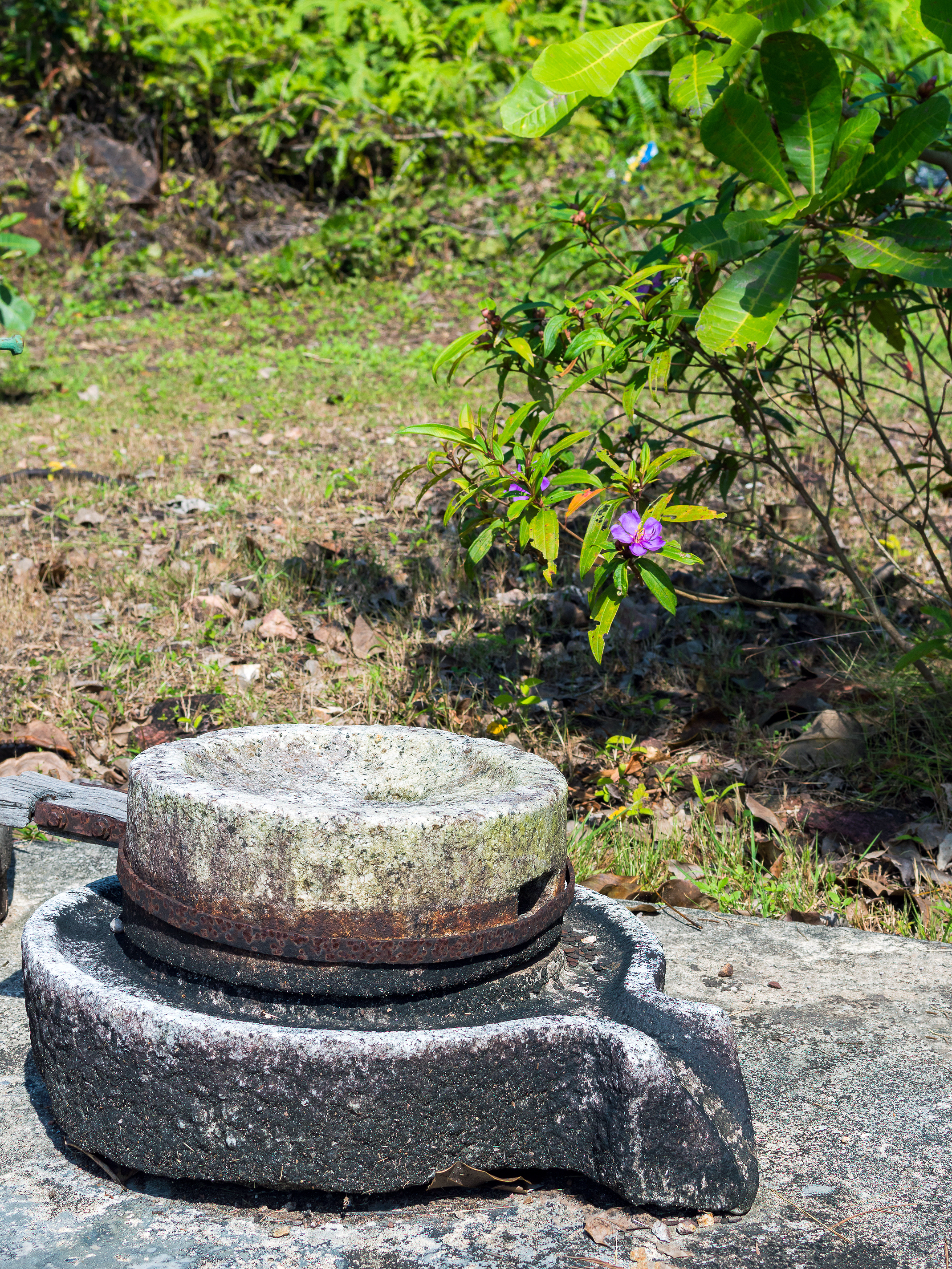 На переднем плане изображён старинный каменный жернов, оставшийся от древнего сельскохозяйственного инструмента, который когда-то использовался для помола зерна. Он расположен на фоне живописного тропического сада, где густая зелень и яркие цветы создают атмосферу умиротворения и природной гармонии. Солнечный свет мягко падает на поверхность камня, подчеркивая его текстуру и следы времени. Вокруг жернова растут лианы, кустарники и цветущие растения, в том числе ярко-фиолетовый цветок, который добавляет изображению живости и контраста. Композиция фотографии сбалансирована: жернов занимает центральное место, а фон смягчён размытым эффектом, что позволяет зрителю сосредоточиться на главном объекте. Сцена передаёт ощущение спокойствия, уважения к истории и природной красоте. Это изображение идеально подходит для тем, связанных с историей, археологией, экологией и культурным наследием.