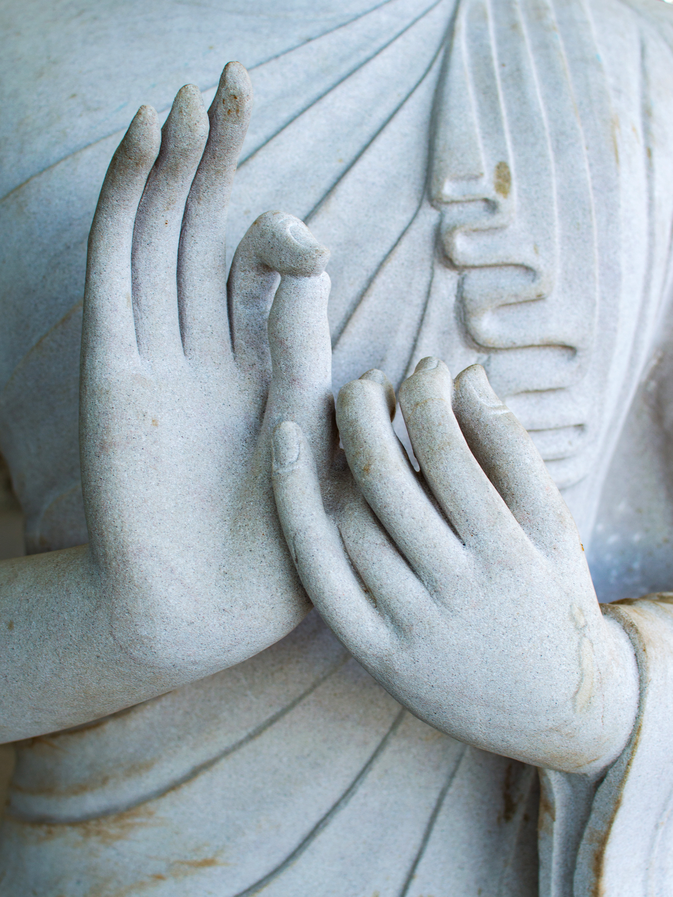 This image is a macro shot of a detail from a Buddha sculpture, likely carved from light stone such as marble or granite. The hands are depicted in the characteristic prayer gesture — one palm pressed to the chest, the other slightly raised, fingers delicately engraved and smoothly transitioning into the garment’s folds. The composition focuses on fine details: visible micro-textures of the stone, natural cracks, and slightly darkened areas from age. The lighting is soft and diffused, emphasizing the relief’s volume and depth. The color palette is neutral — shades of gray and beige — enhancing the sense of antiquity and reverence. The image conveys an atmosphere of peace, tranquility, and spiritual harmony. Visually, it is suitable for religious, meditative, philosophical, and cultural projects. This detail can be used as a symbol of peace, wisdom, and inner balance.