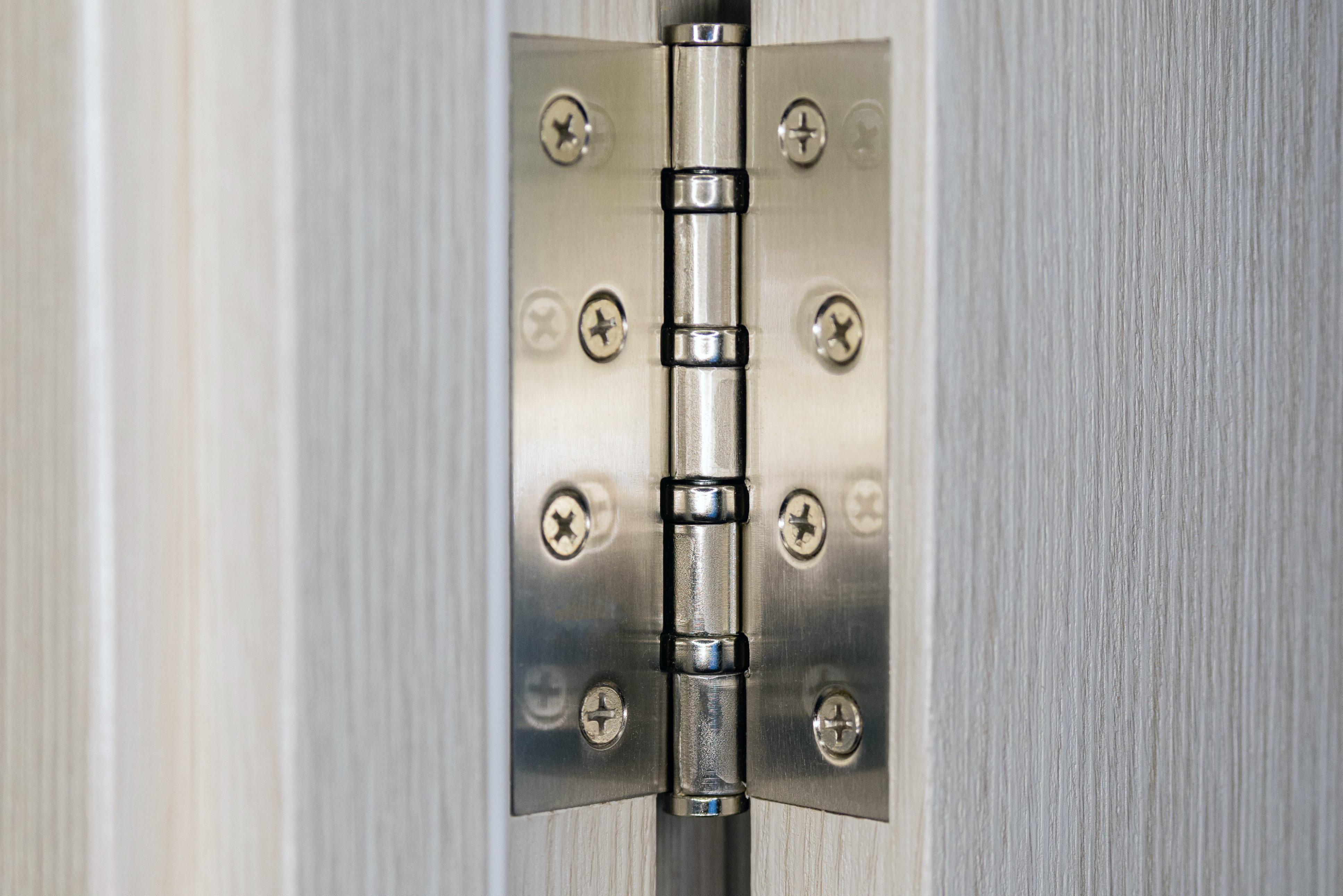 На снимке представлено макроизображение металлической петли, установленной на двери с текстурой дерева. Съемка выполнена в помещении при равномерном освещении, что позволяет четко видеть все детали. Петля изготовлена из матового металла с оттенком серебра, на ней видны шестигранные отверстия и шурупы с крестообразной насечкой. Деревянная поверхность двери имеет вертикальную текстуру, напоминающую натуральную древесину. Композиция симметрична, с акцентом на центральную ось петли. Цветовая палитра нейтральная — серые, бежевые и металлические оттенки создают ощущение современности и минимализма.