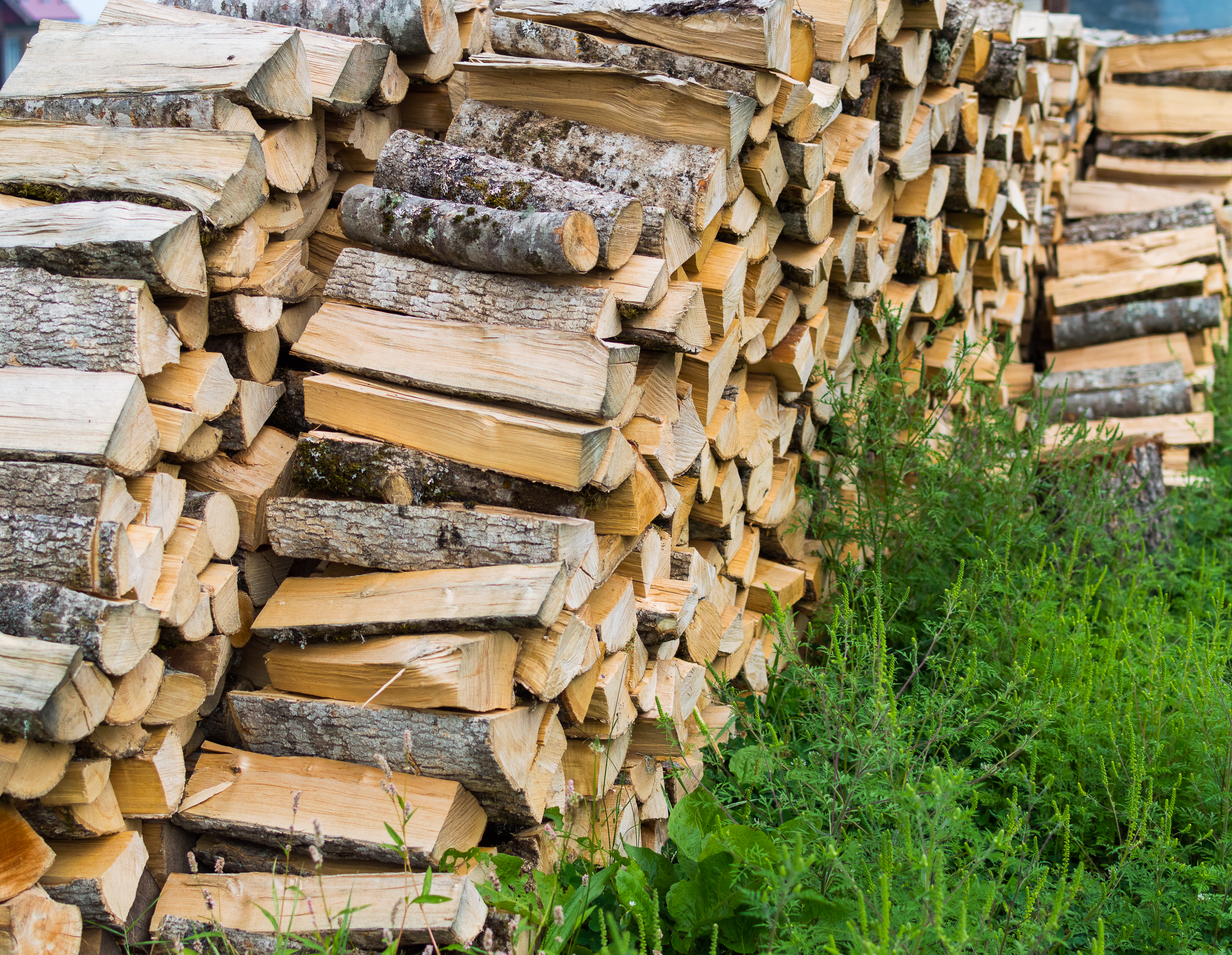 The viewer is presented with a calm and peaceful scene of an autumn landscape. The center of the composition is occupied by neat rows of stacked firewood, forming a geometric pattern against lush green grass. It seems like this place – a quiet corner of a country house or cottage, where time slows down its pace. Judging by the rich color of the grass and the texture of the tree bark, the season is late autumn or early winter. The air is filled with the scent of freshness and approaching cold. This scene evokes a feeling of warmth from a cozy home and readiness to meet the winter frosts with comfort and security. The whole picture breathes tranquility and anticipation of winter evenings spent with family by the fireplace.